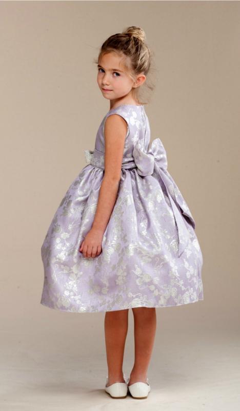 Ljuvlig brudnäbbsklänning / festklänning i shimrande lila och silver. Rosmotiv med rosor och grenar i silver på det lila tyget. Brett band i midjan som fortsätter i ryggen och kan knytas till en stor rosett. Stor avtagbar rosett i silver pryder midjan. Underkjol med tyllkant ger extra vidd. Blixtlås i ryggen.