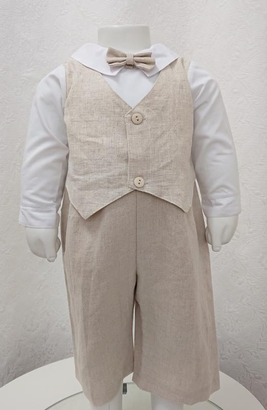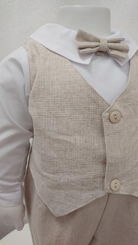 Vacker allt-i-ett babykostym i beige med vit långärmad skjorta. Västen och byxan är i naturmaterial linne, västen svart rutig och byxdelen samt flugan är släta. Västen är ihopsydd med kostymen på sidor och på axlar. Detta är en overall variant av en babykostym, lätt att sätta på med tyrggknappar i ryggen. Mycket bekväm lite bredare och ledigare modell. Din lille prins blir den stiligaste på hela festen.