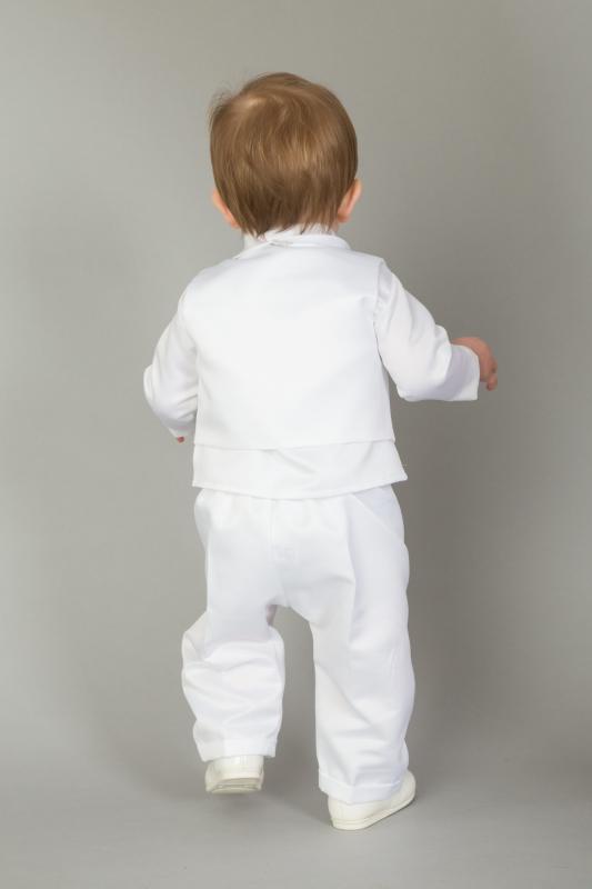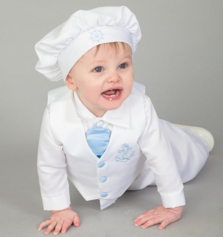 Stilig vit dopkostym / babykostym. Långärmad skjorta och långa byxor samt väst och ljusblå kravatt. Byxor har resor i midjan och slag i byxan. Västen har ljusblåa knappar och ljusblå ankare broderad på. Matchande ljusblå kravatt med gummiband kompletterar kostymen. Sjömans mössa medföljer. Hela kostym är tillverkad av mjukt och lite glansigt satin tyg.