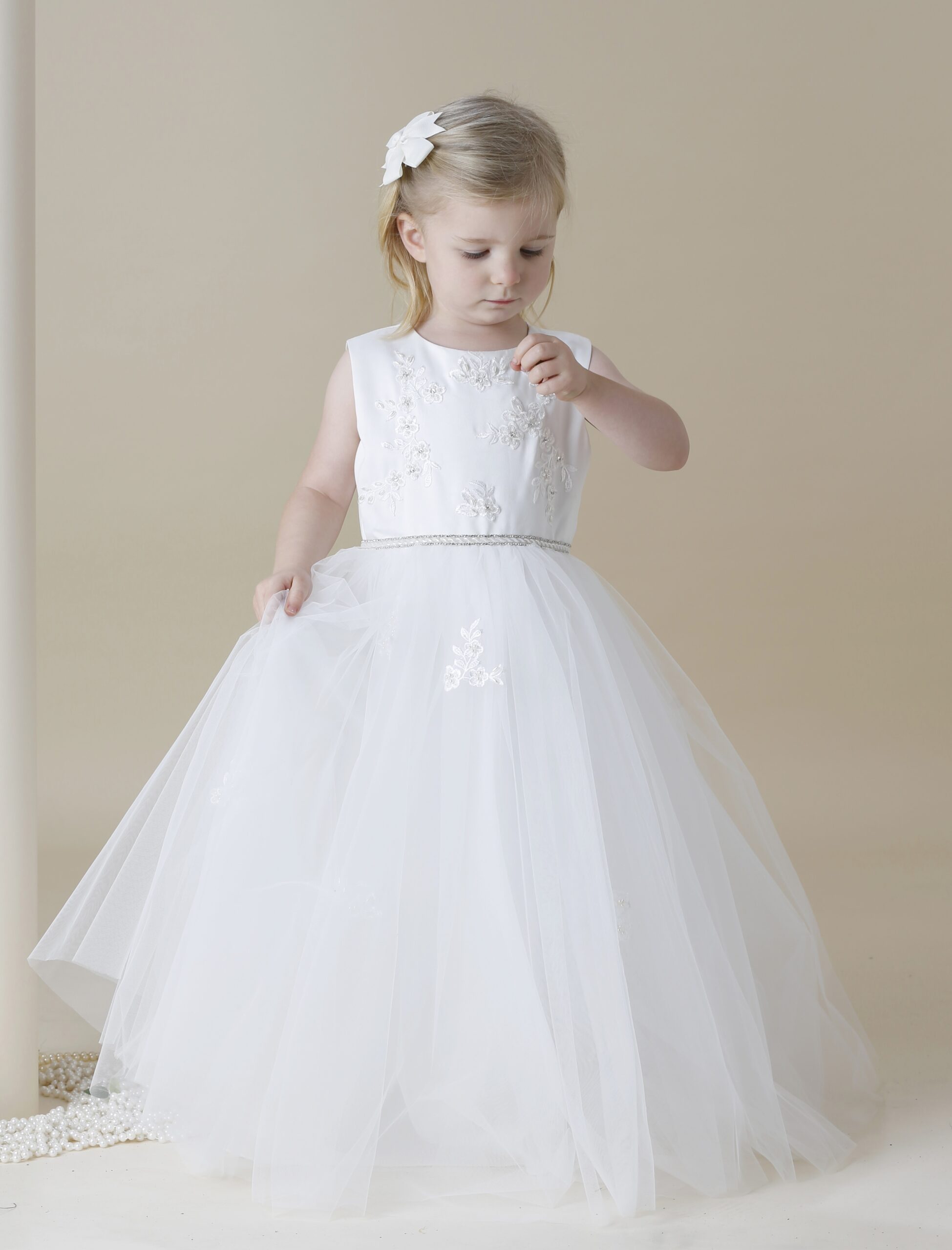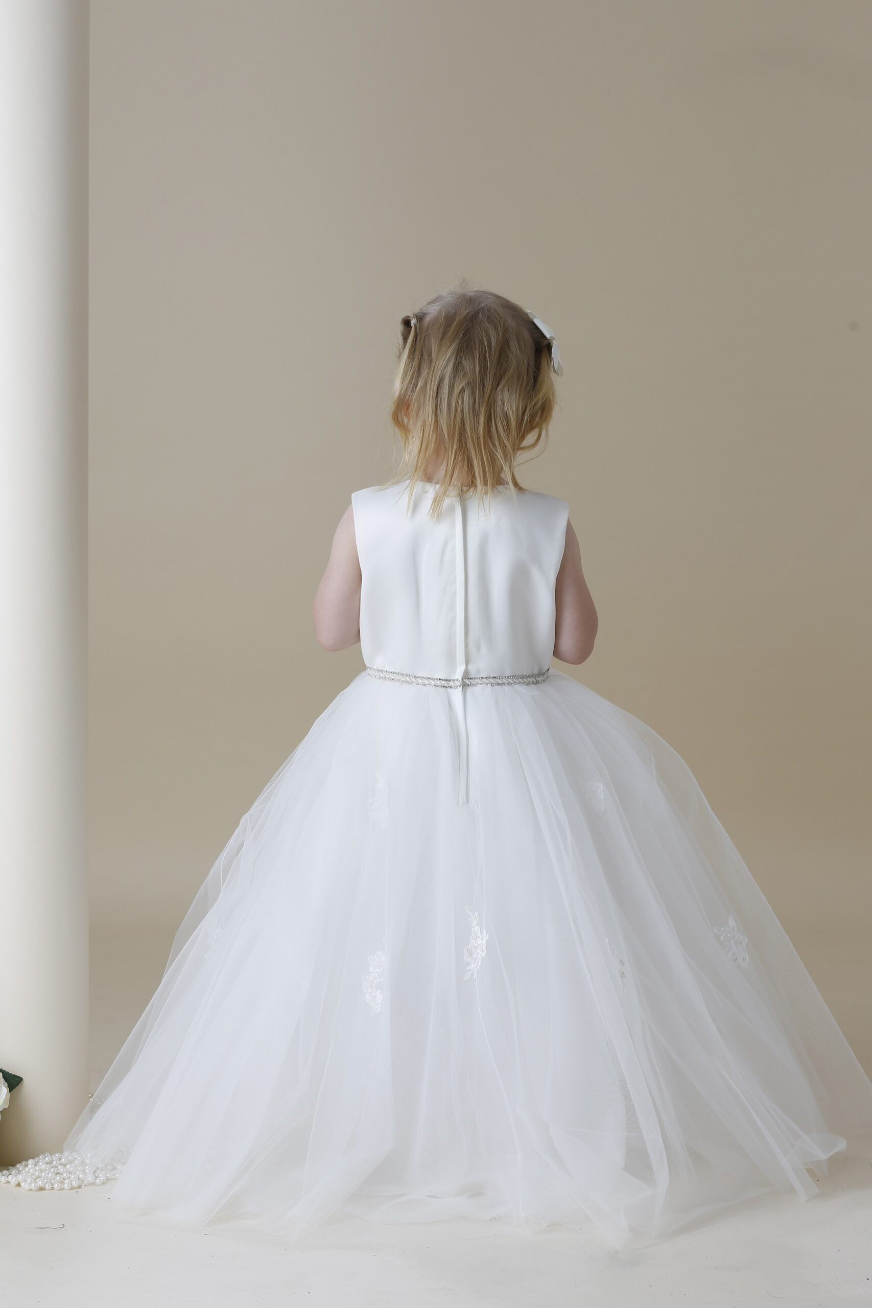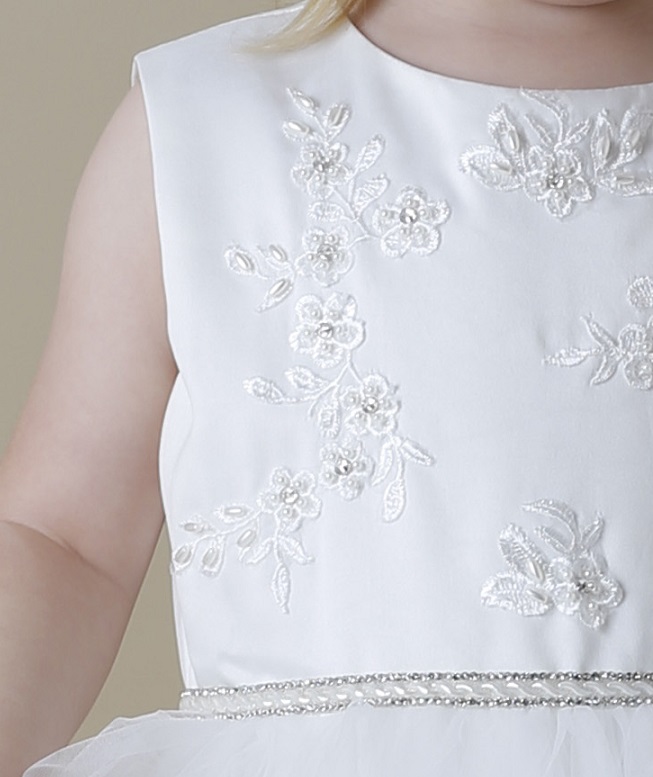 Vacker benvit lång näbbklänning / festklänning för barn. Vackra spetsapplikationer på satin byst och på tyllkjolen. Smalt band med diskret bling. Vid tyllkjol som består av 3 lager tyll, under det satintyg och under satintyget underkjol med styvare tyllkant för att ge extra vidd till kjolen. Blixtlås baktill.