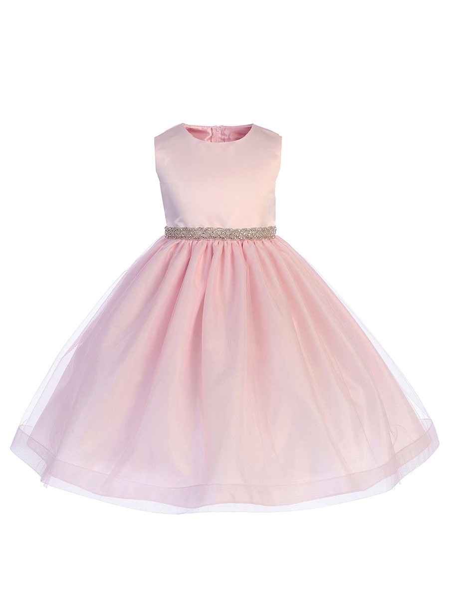 Elegant och vacker rosa festklänning för dop, fest och bröllop. Armlös barnklänning med vackert band i silver på framsidan av midjan. Tyllkjol med extra förstärkning vid kjolfållet för att ge extra vidd, underkjol med tyllkant. Blixtlås baktill. Perfekt till alla kommande högtider – en riktig prinsessklänning!