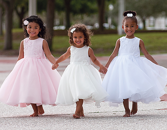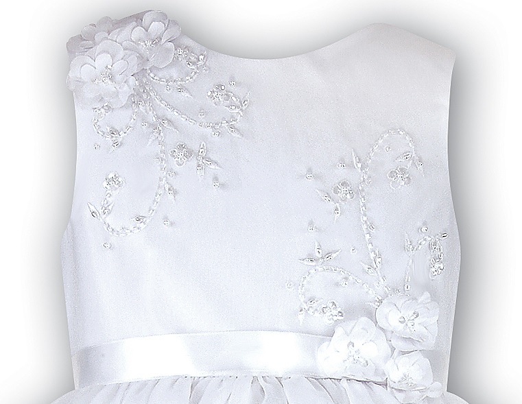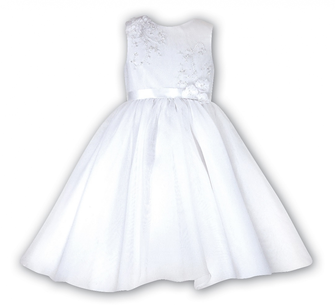 Underbar ärmlös brudnäbbsklänning. Livet är dekorerad med paljetter, pärlemor och sidenblommor. Tunnt band på midjan. Stor rosett på ryggen. Blixtlås baktill. Mycket vid kjol med tyll under organza tyget.