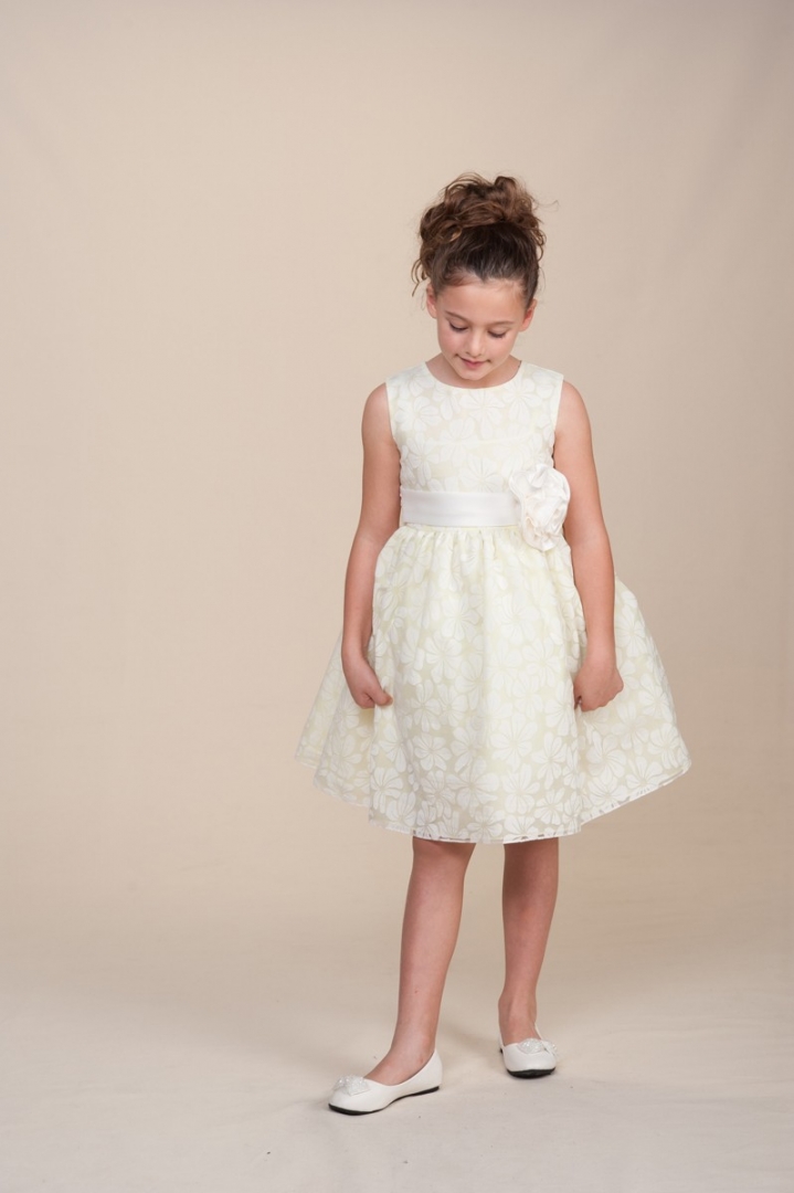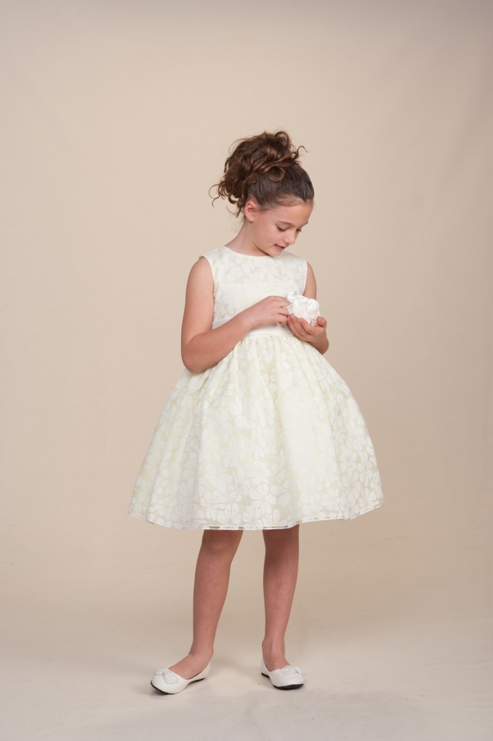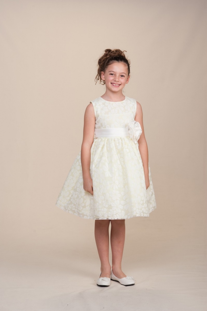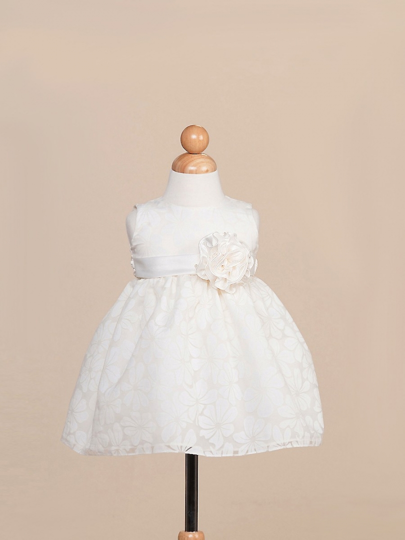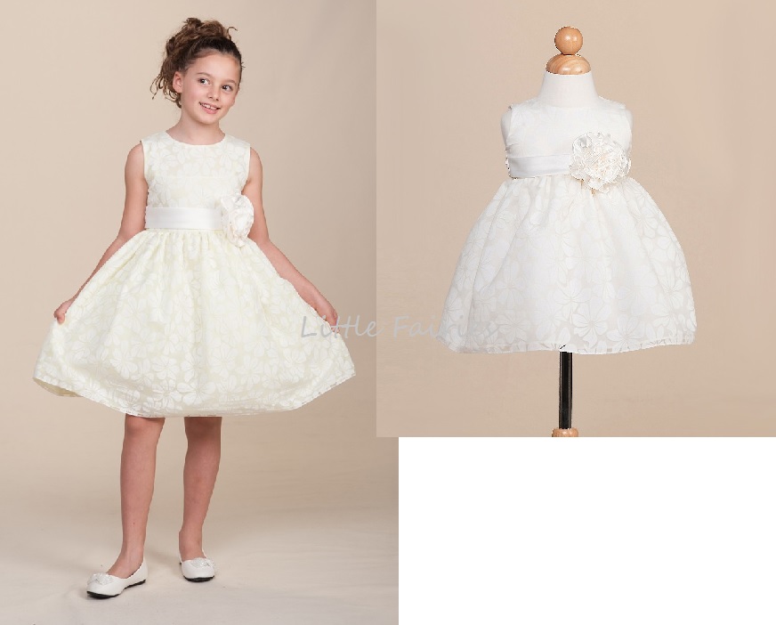 Ljuvlig benvit ärmlös brudnäbbsklänning. Mönstrad tyg med stora benvita blommor. Brett satinband på midjan som kan knytas till en rosett på ryggen. Underkjol med tyllkant. Mycket söt klänning som kan användas på dop, kalas, fest och bröllop.