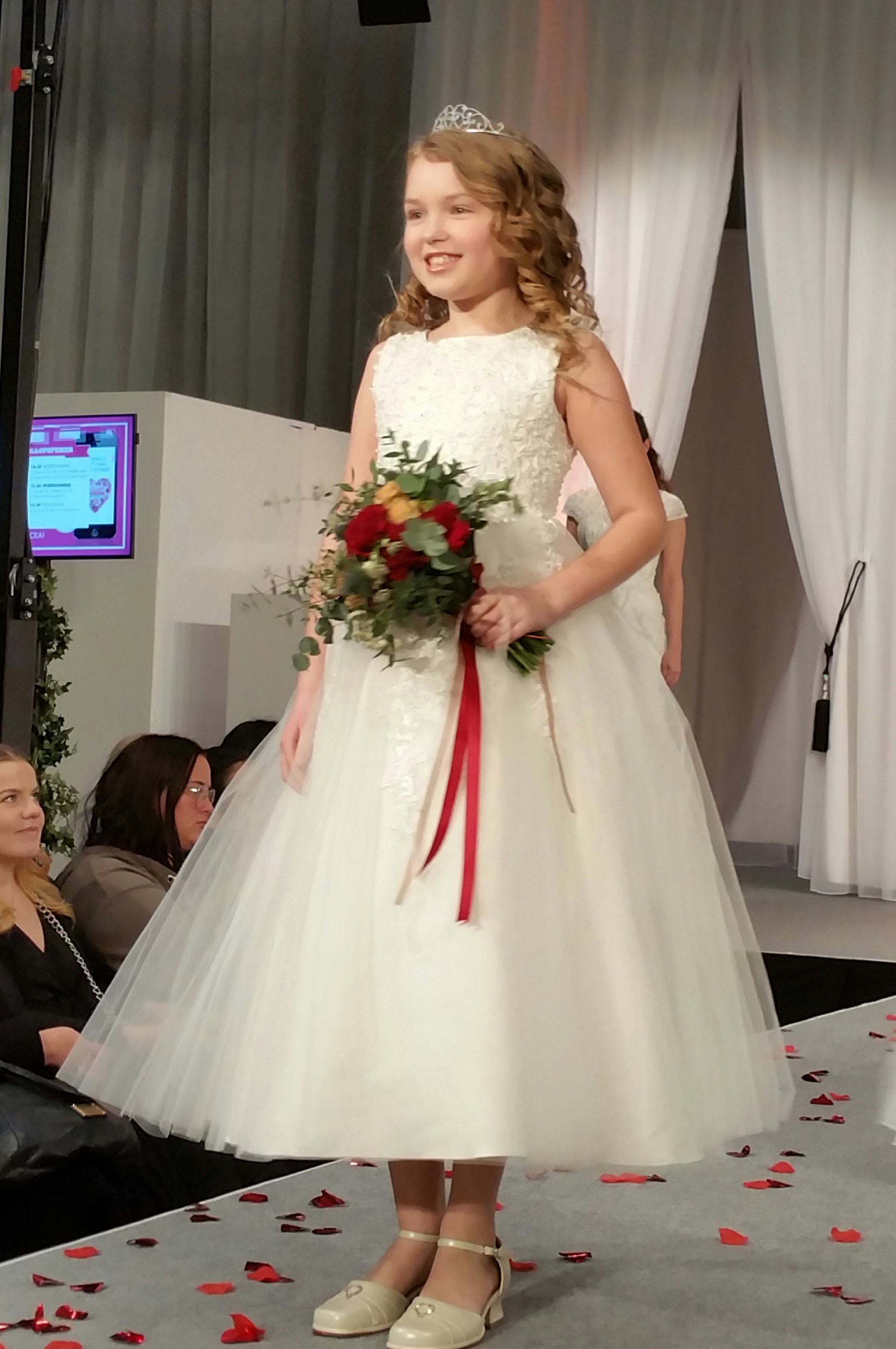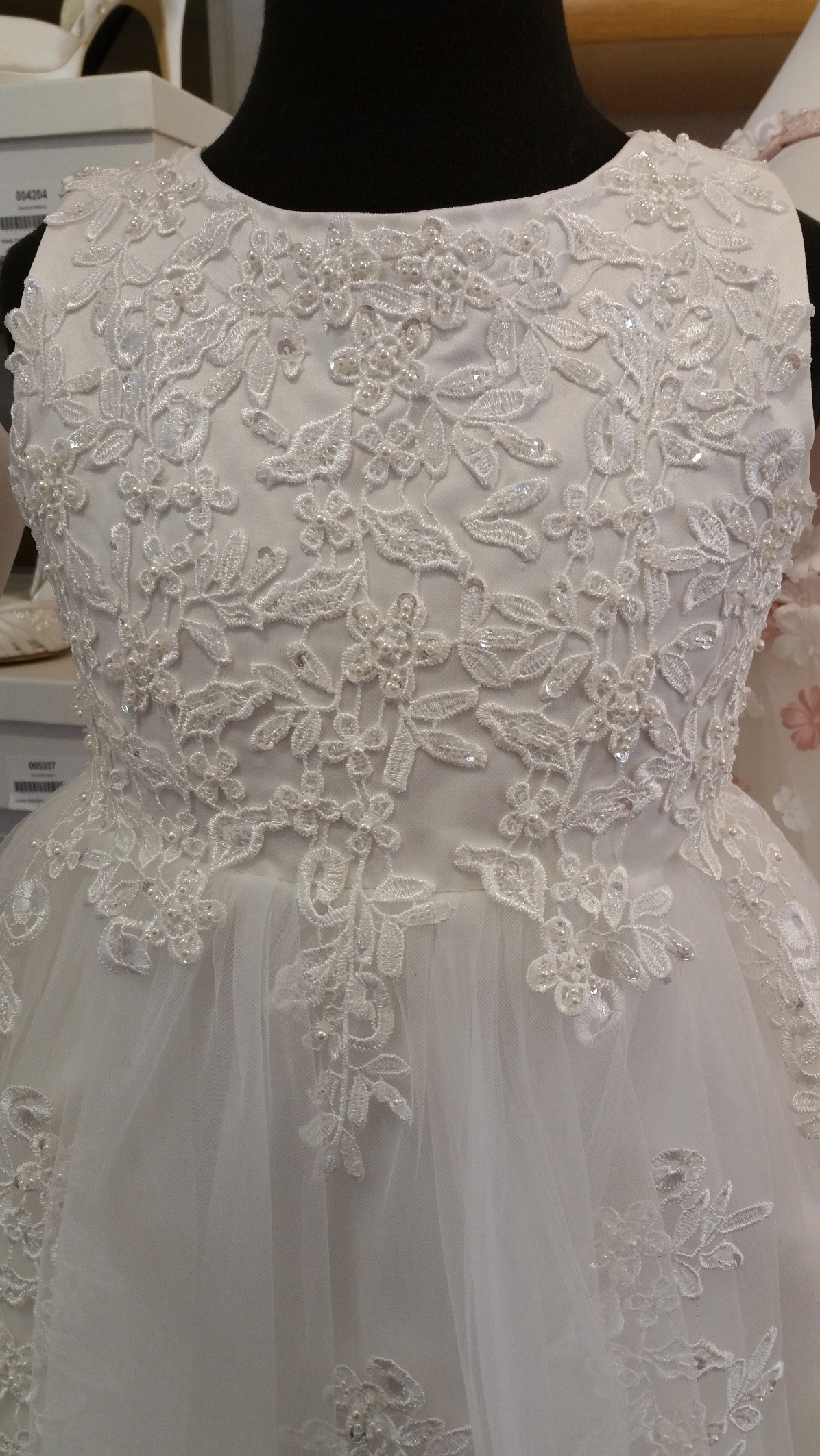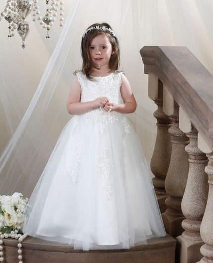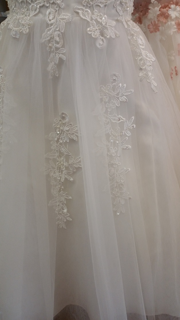 Exklusiv lång bröllopsklänning / festklänning för barn. Vacker spets med paljetter dekorerar både framsidan och baksidan på både liv och tyllkjol. Tyllkjol består av 3 lager tyll, under det satintyg och under satintyget underkjol med tyllkant. Blixtlås baktill. Mycket populär modell!