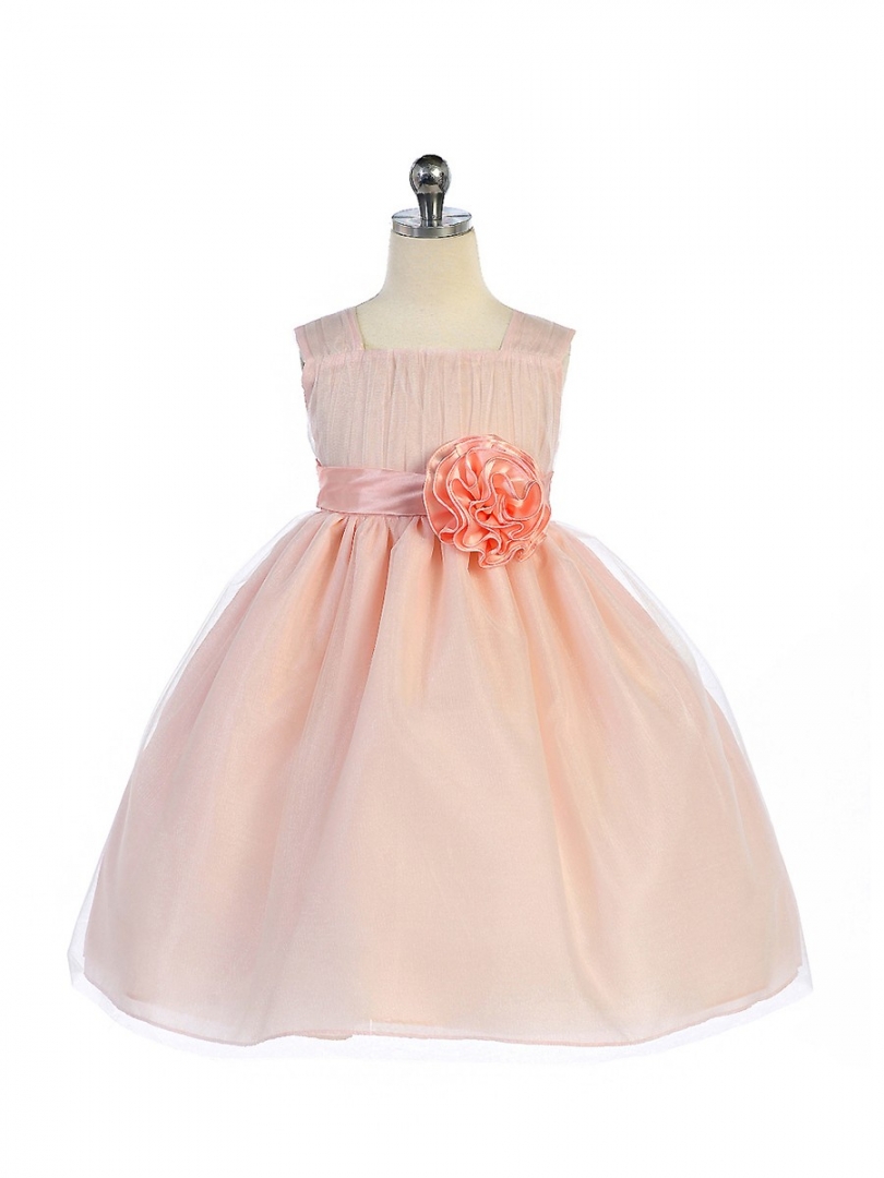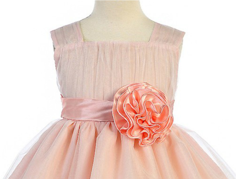 Ljuvlig ärmlös klänning i tyll. Stilren liv med veckad tyll. Fyrkantig halsöppning. Satinband och avtagbar sidenblomma dekorerar midjan. Kjol består av flera lager tyll. Knytband och blixtlås i ryggen. Mycket fin klänning som passar perfekt till fest och bröllop.