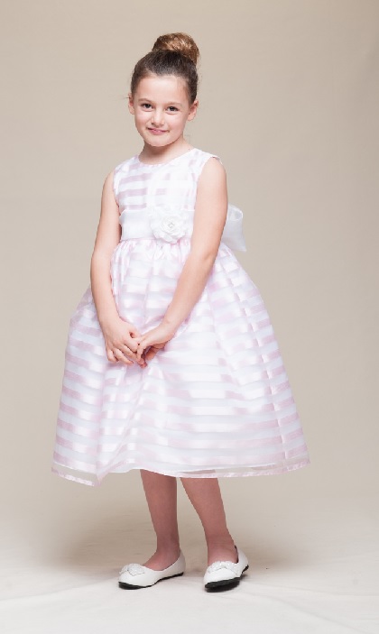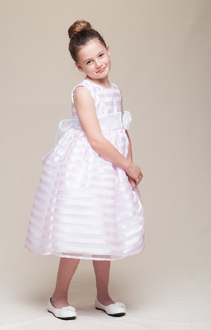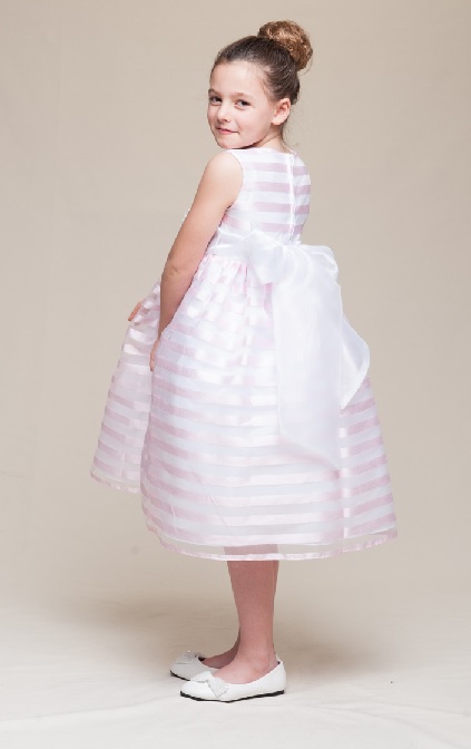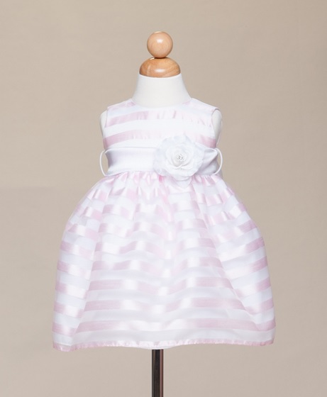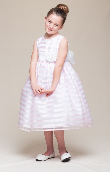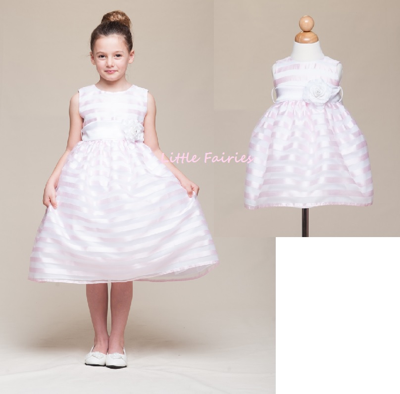 Stilig ärmlös finklänning i organza. Genomskinligt rosa randigt tyg överst, under det vitt tyg. Brett vitt avtagbar organzaband på midjan med avtagbar rosett framtill. Underkjol med tyllkant. Blixtlås baktill. Mycket använbar klänning till dop, fest, kalas och bröllop.