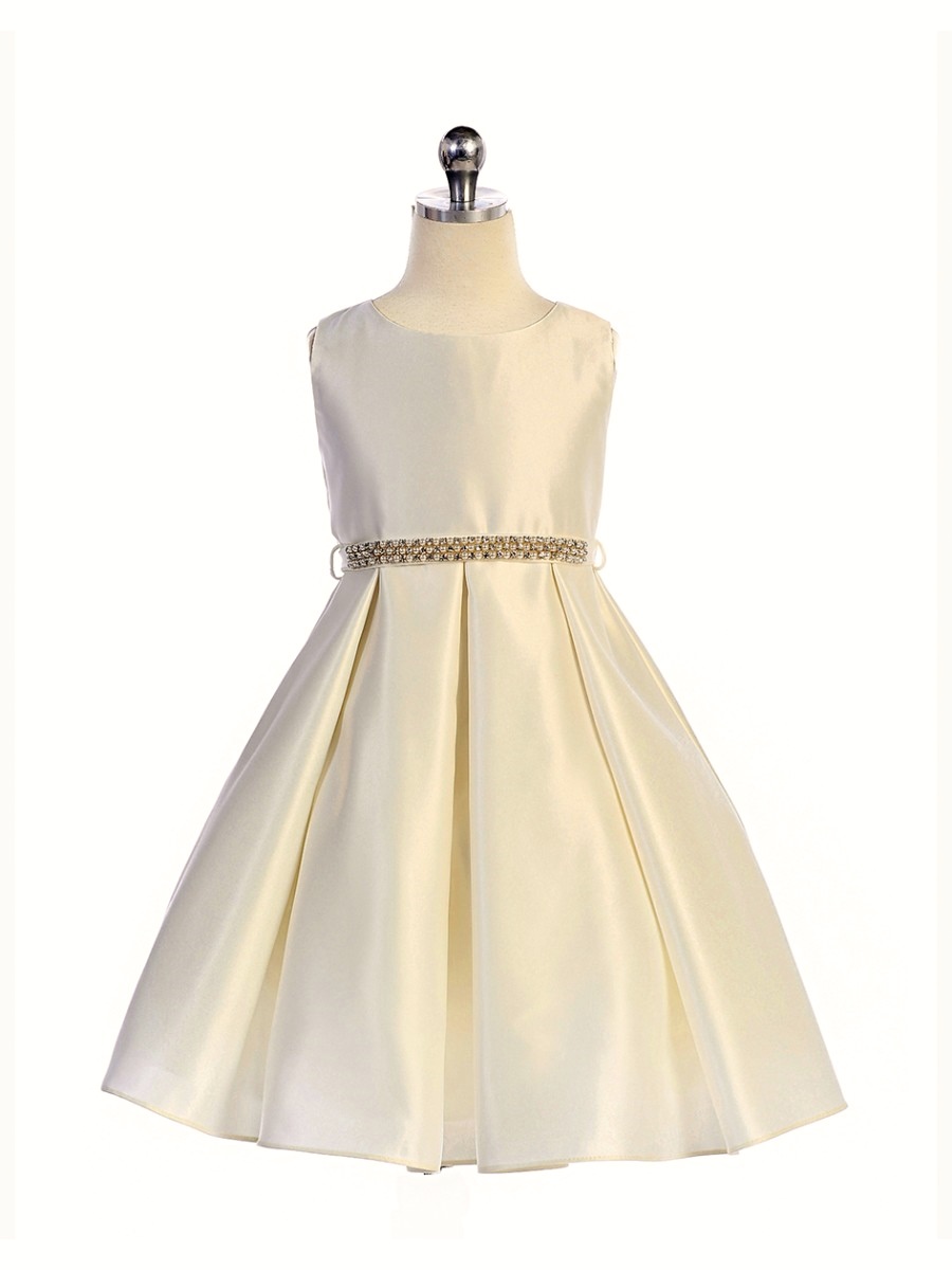 Elegant klänning i benvit satin. Avtagbar lite mörkare sidenbälte där framsidan är dekorerad med strass, kan knytas till en rosett baktill. Bältet kan lätt bytas till ett annat bälte i önskad färg. Underkjol med tyllkant. Blixtlås i ryggen.