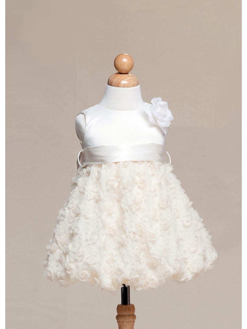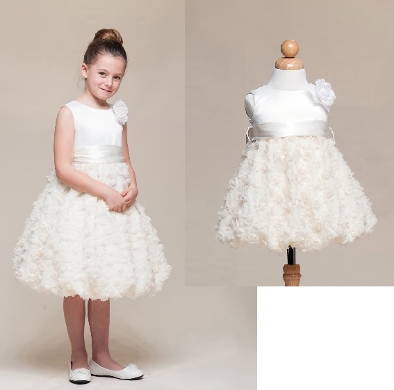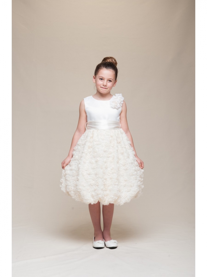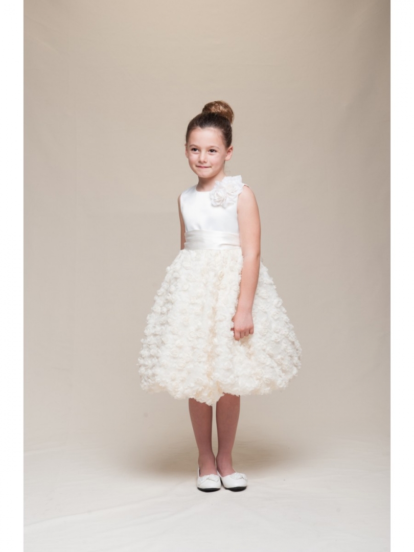 Ljuvlig ärmlös brudnäbbsklänning med ballongkjol derokerad med små tygblommor! Avtagbar brett satinband på midjan som kan bytas till en annan önskad färg för att matcha med festens färgtema. Bandet kan knytas till en rosett baktill. Avtagbar sidenblomma. Blixtlås baktill. Mycket fin klänning till brudnäbb eller till kalas och fest.