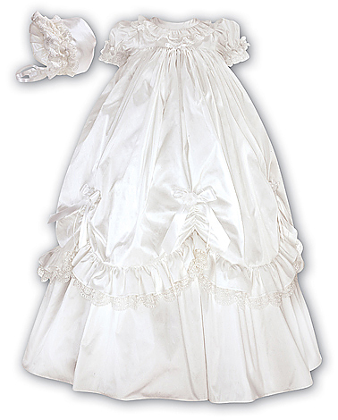 Unik dopklänning i siden med korta puffärmar kantade med spets och dekorerade med sidenblomma och sidenrosett. Volang- och spetskant runt halsöppningen. Kjodelen är dekorerad med volanger och spetskant i olika lager. Sidenrosetter och sidenblommor dekorerar kjolen. Knäppning baktill. Underkjol med rejäl tyllkant ger extra vidd till klänningen. Matchande vacker dophätta.