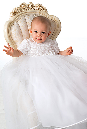 Ljuvlig benvit dopklänning med söta korta ärmar och exklusiv spets på överdelen och ärmar. Livet är dekorerad med fåtal pärlor och paljetter. En stor och fyra små blommor pryder vänstra sidan av midjan. Kjolen består av två lager tyll med en vacker sidenkant i olika längder. Under det lite styvare tyll samt underkjol med tyllkant. Bomull/polyestertyg närmast till barnet. Knäppning baktill. Matchande hätta medföljer. Mycket vacker och romantisk modell.