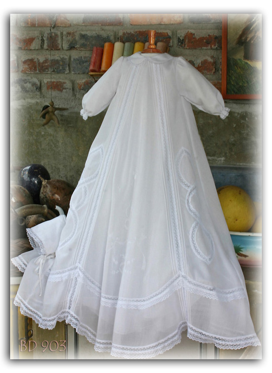 Ljuvlig vit dopklänning och dophätta i finaste bomull med rikliga dekorationer.