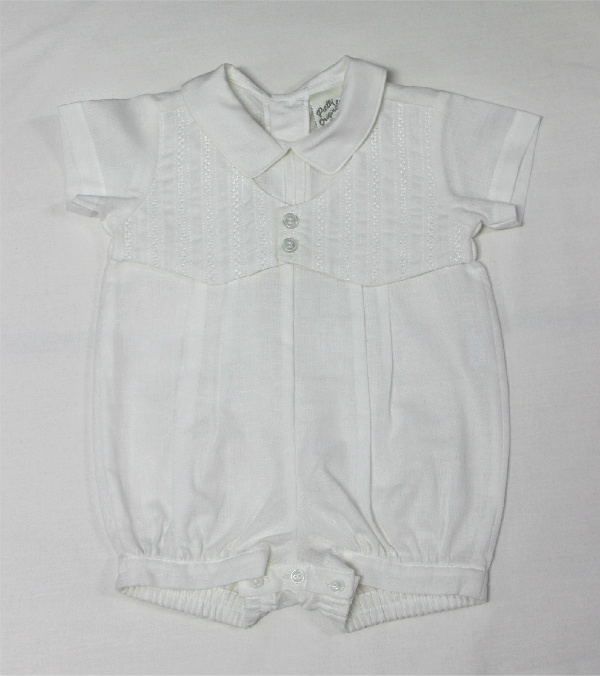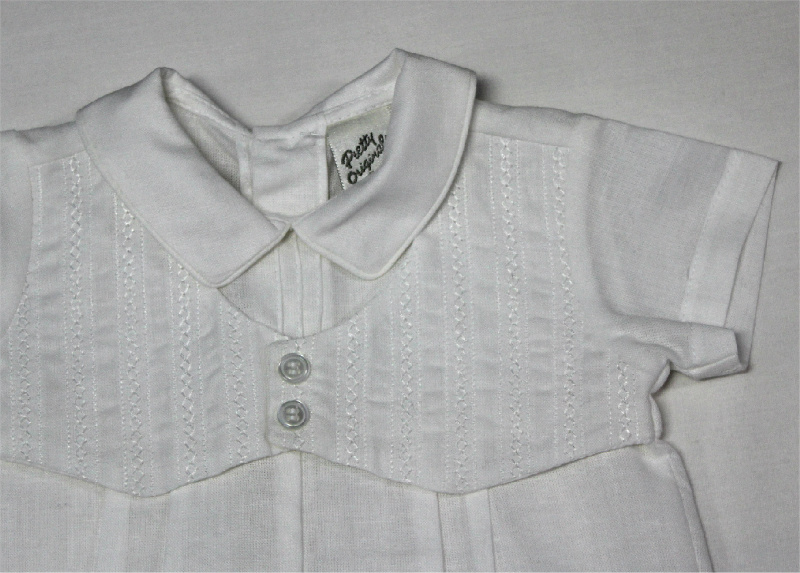 Ljuvlig vit dräkt med korta ärmar och utan ben. Fastsydd väst med knappar. Västen har vacker mönster på. Två små veck på var sin sida ger lite mer utrymme till lilla barnet. Knäppning i ryggen och mellan ben. Matchande basker medföljer. Mycket söt dopdräkt som kan användas i även andra sammanhang.