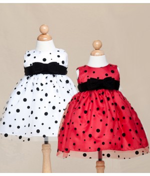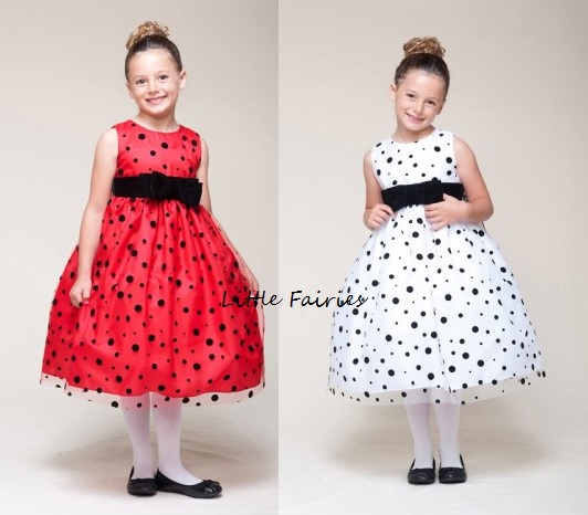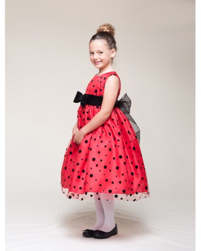 Gillar du prickigt? Vacker ärmlös festklänning i vitt eller rött. Tunnt tyllager överst med svarta sammetsprickor i olika storlekar på. Under det satintyg och underst underkjol med tyllkant. Brett svart sammetsband på midjan framtill. Baktill breda svarta organzaband som kan knytas till en rosett. Blixtlås baktill. Underbar festklänning och brudnäbbsklänning.
