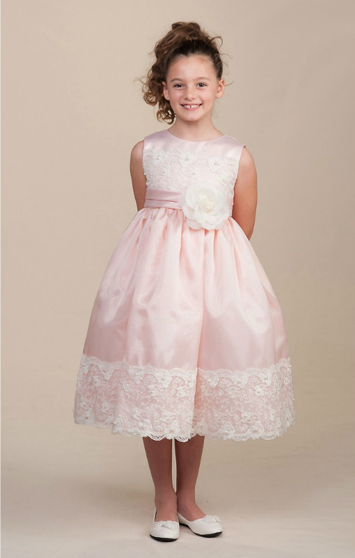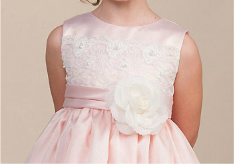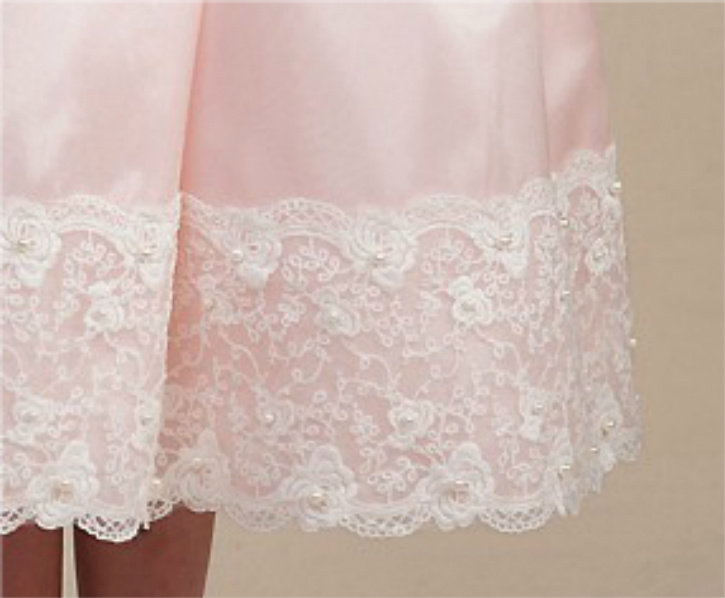 Vacker ärmlös brudnäbbsklänning i satin. Rund halsringning. Livet är dekorerat med brett spetband med små pärlor. Veckad band och avtagbar sidenblomma pryder midjan. Knytband i ryggen. Stilren kjoldel med samma spetkant som på livet. Blixtlås baktill.