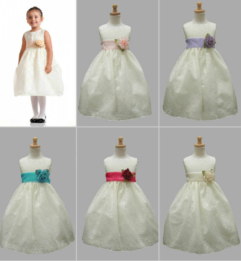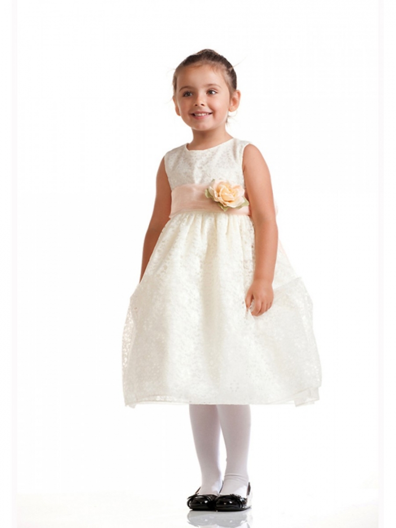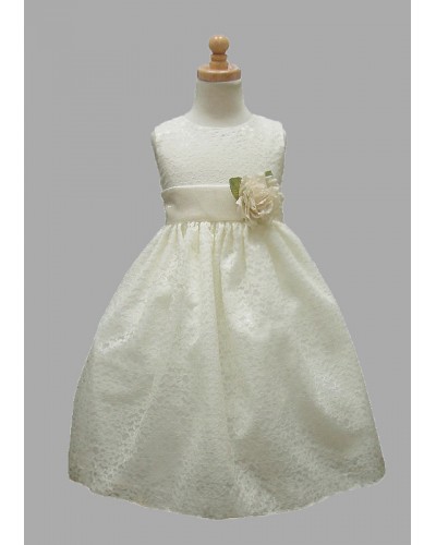 Gräddvit festklänning i vackert spets med avtagbart organzaband och blomma. Finns i storlekar 92 – 134/140 cm. Nytt ordinarie LÄGRE PRIS!