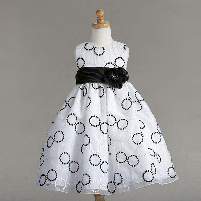 Ljuvlig vit ärmlös näbbklänning med svarta och vita broderade prickiga ringar över hela klänningen. Organza tyg över tunn satin, underst underkjol med tyllkant. Brett svart organzaband på midjan som kan knytas till en stor rosett baktill. Stor avtagbar svart sidenblomma på midjan. Blixtlås baktill. Mycket vacker klänning passandes till alla högtider.