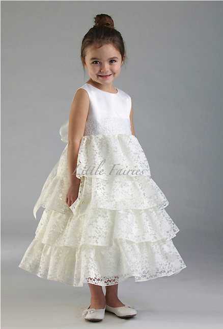 Gräddvit ärmlös festklänning med stilig satin överdel. Kjoldel består av flera lager spetsvolanger, under detta tunnt satin och underst underkjol med spetskant för extra vidd. Brett band på ryggen som kan knytas till en rosett. Blixtlås baktill. Så ljuvligt!