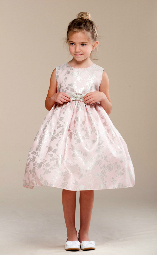 Ljuvlig brudnäbbsklänning / festklänning i shimrande rosa och silver. Rosmotiv med rosor och grenar i silver på det rosa tyget. Brett band i midjan som fortsätter i ryggen och kan knytas till en stor rosett. Stor avtagbar rosett i silver pryder midjan. Underkjol med tyllkant ger extra vidd. Blixtlås i ryggen.