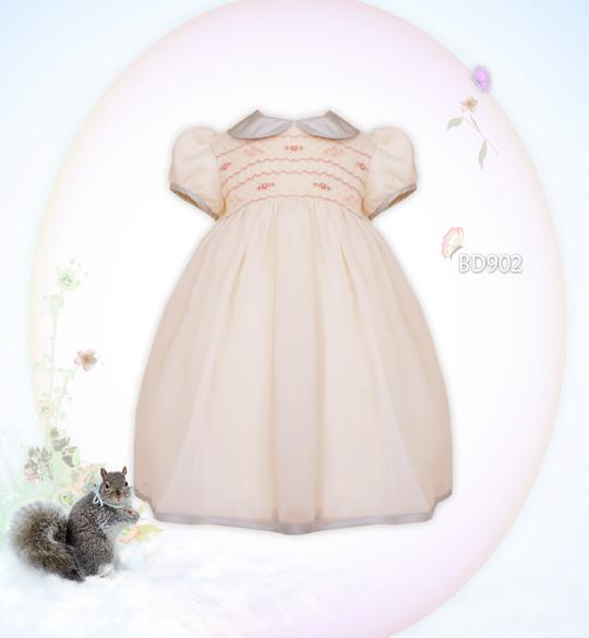 Otrolig vacker och skir småckad festklänning i ivory och silverblå. Organza tyg över det ivory satin. Broderade små rosa blommor på smockat liv. Silverblå krage, samma färg förekommer i kanten av korta puffärmar samt längst ner i kjolkanten. Bred organza band på ryggen som kan knytas till en rosett. Knäppning baktill. Underkjol i bomull/polyester. Denna klänning är ljuvlig och passar till alla speciella stunder!
