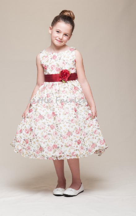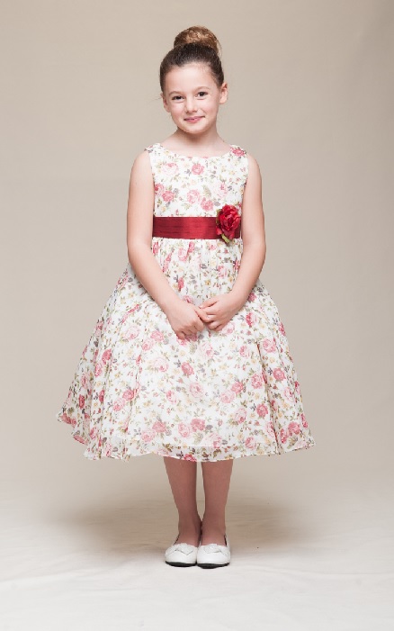 Modern vintage inspirerad romantisk klänning med gammeldags röda och aprikosfärgade rosor på. Ärmlös klänning med brett rött band på midjan som kan knytas till en stor rosett på ryggen. Röd avtagbar sidenblomma dekorerar midjan. Underkjol med tyllkan som ge volym till kjolen. Vacker brudnäbbsklänning!