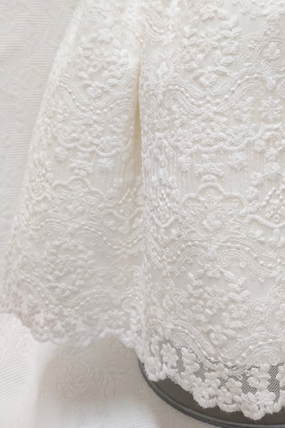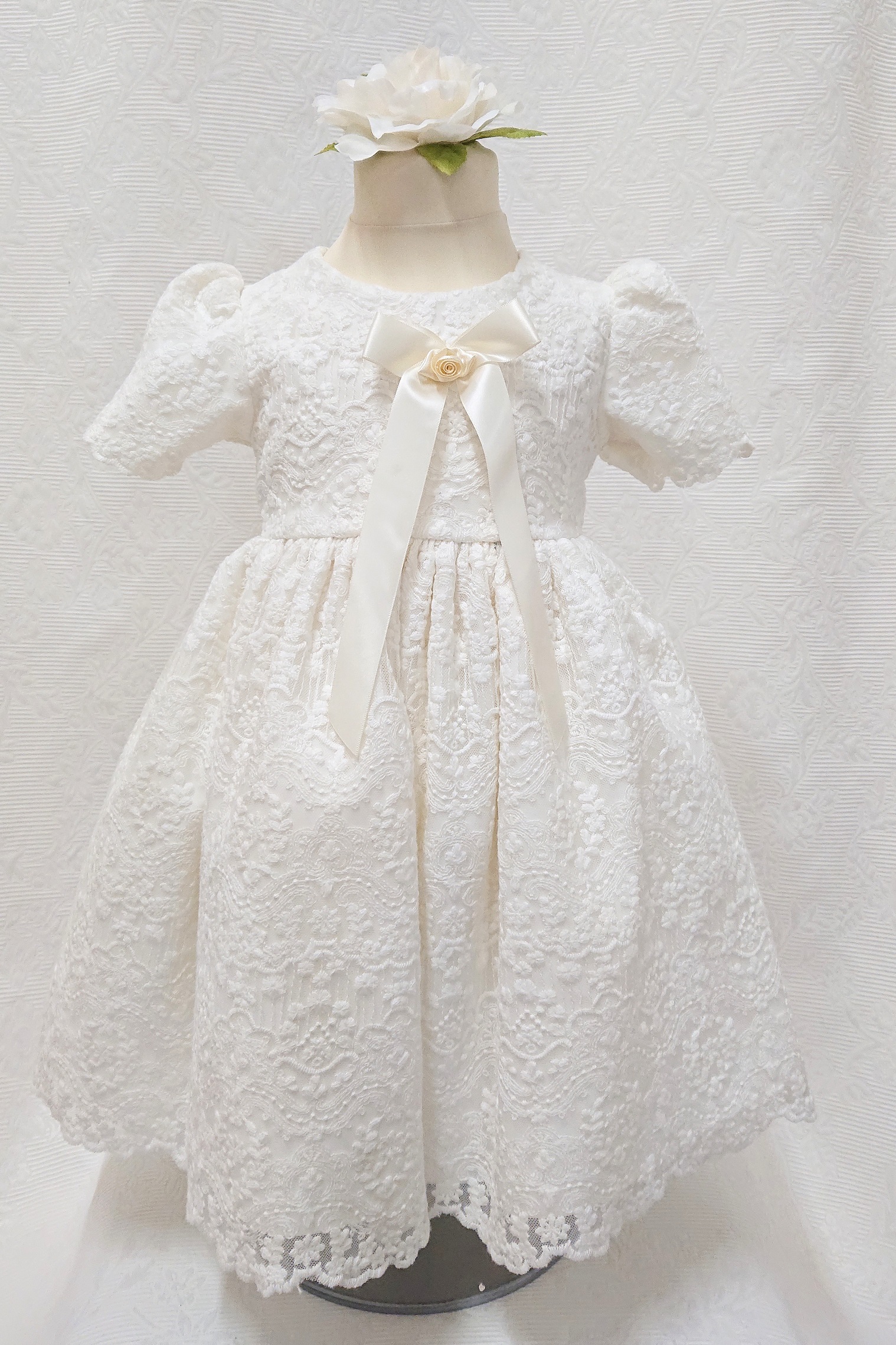 Vacker festklänning med söta puffärmar och rund halsringning. Rynkad midja ger vidd till kjolen. Denna prinsessklänning är tillverkad av grövre bomullspets som har nästa 3D känsla. Mycket vackert! Stor sidenrosett pryder livet. Blixtlås i ryggen och underkjol med extra tyllkant. Denna barnklänning passar lika perfekt till dop, kalas, födelsedag och bröllop.