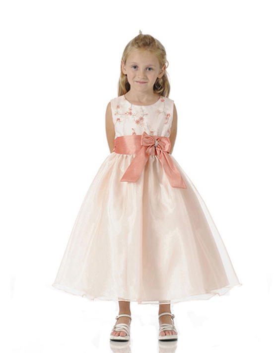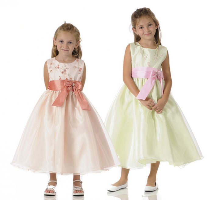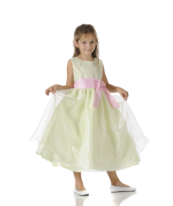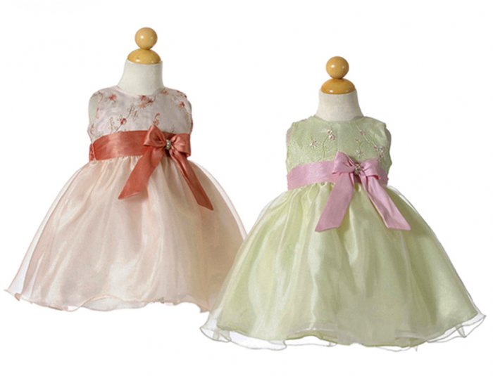Mycket stilig och elegant ärmlös festklänning/näbbklänning i mjuk korall eller ljusgrönt. Sidenband på midjan fortsätter på ryggen och kan knytas till en rosett. Den korallfärgade klänningen har mörkare sidenband och broderier på livet, den ljusgörna klänningen har rosa sidenband och rosa broderier på livet (se bild). Matchande avtagbar rosett med strassdekoration på midjan. Kjoldelen består av organza tyg övrest, sedan tunn satinaktigt tyg och unders underkjol med tyllkant. Mycket vacker festkänning – passar till alla högtider.