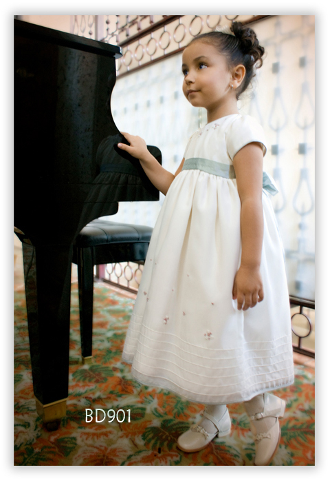 Otrolig vacker och skir ivory och silverblå festklänning. Organza tyg över det ivory satin. Broderade små rosa blommor under halsringningen och på nedre delen av kjolen ovanpå stråveck. Silverblå band på midjan som kan knytas till en rosett baktill. Knäppning på ryggen. Kjolen, korta ärmar och krage är alla kantade med silverblå band. Knäppning baktill. Underkjol i bomull/polyester. Denna klänning är ljuvlig och passar till alla speciella stunder!