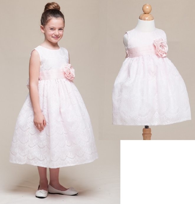 Fantastiskt vacker ärmlös brudnäbbsklänning. Fin fin vit spets över rosa satängtyget. Underst underkjol med tyllkant för att ge extra vidd. Brett rosa band och rosa avtagbar sidenblomma dekorerar midjan. Bandet fortsätter på ryggen och kan knytas till en stor rosett. Blixtlås baktill.