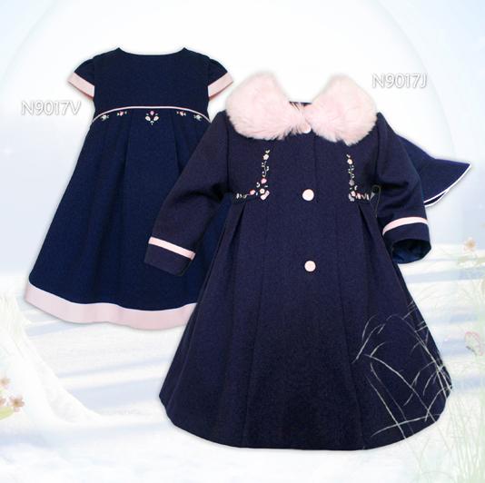 Ljuvlig elegant mörkblå och rosa 3-delad set som består av mörkblå-rosa kappa, mössa och klänning. Vacker kappa med rosa och vita broderier på framsidan. Veck från broderier och ner. 3 st knappar klädda med rosa tyg. Rosa band dekorerar nedre delen av ärmen. Rosa fuskpäls på kragen. Baksida har en veck i mitten från midjan och ner för att göra kappan extra bekväm. Mörkblå hätta. Mörkblå klänning med korta ärmar. Ärmkant, halsöppningen och kjolfållen är kantad med rosa tyg. Rosa broderier under det smala bandet på midjan. Små veck på var sin sida framme. Alla tre delar är helfodrade. Mycket elegant och stiligt för den lilla!