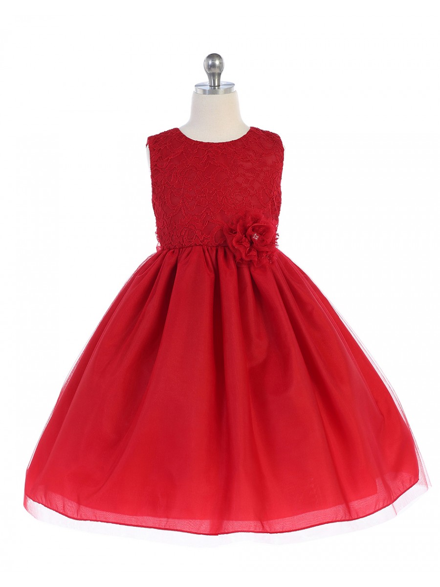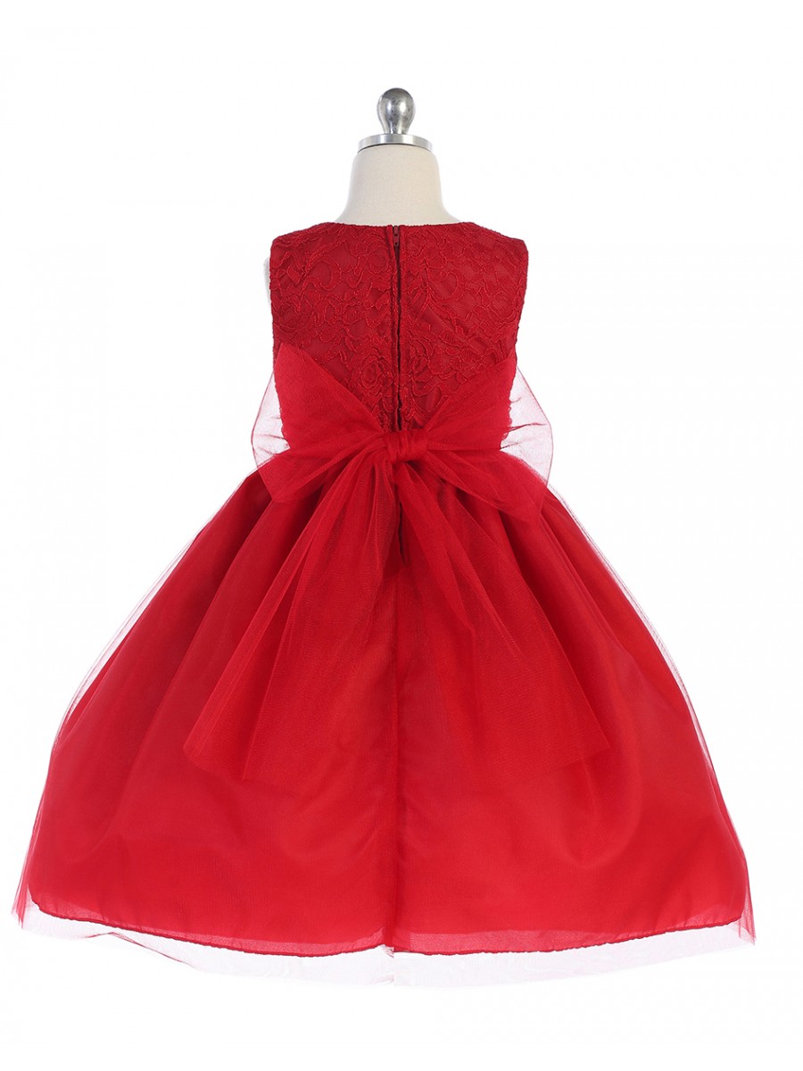 Elegant röd festklänning / brudnäbbsklänning. Ärmlös finklänning med vacker spets både fram och bak på överdelen. Vid organzakjol. Underkjol med tyllkant ger extra vidd till kjolen. Knytband och blixtlås baktill. Längd vadlång. Passar fint till kommande fester och högtider. OBS! blomma ingår ej.