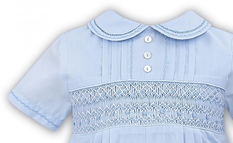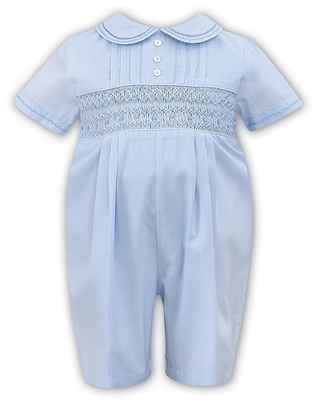 Vacker festkostym i engelsk kunglig stil till en liten pojke. Korta ärmar och knälånga byxor. Exklusiv smockning på bysten med vita detaljer. Broderingar runt kanten på kragen, ärmar och ben. Passar perfekt såväl till dop, fest och bröllop. Så fint till den lille bebisen!