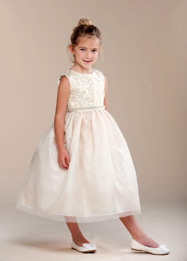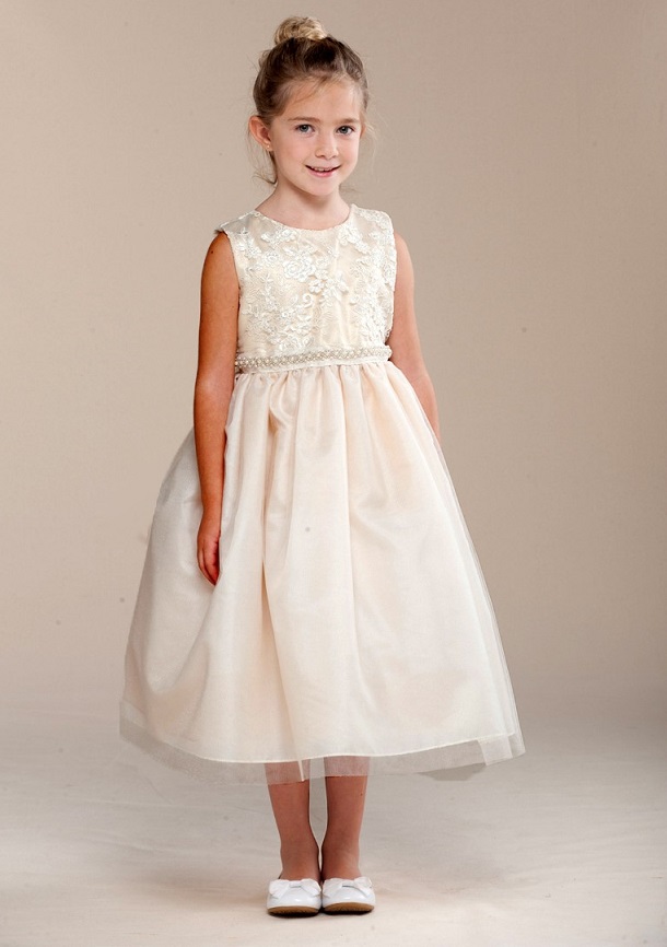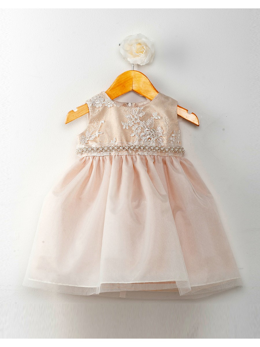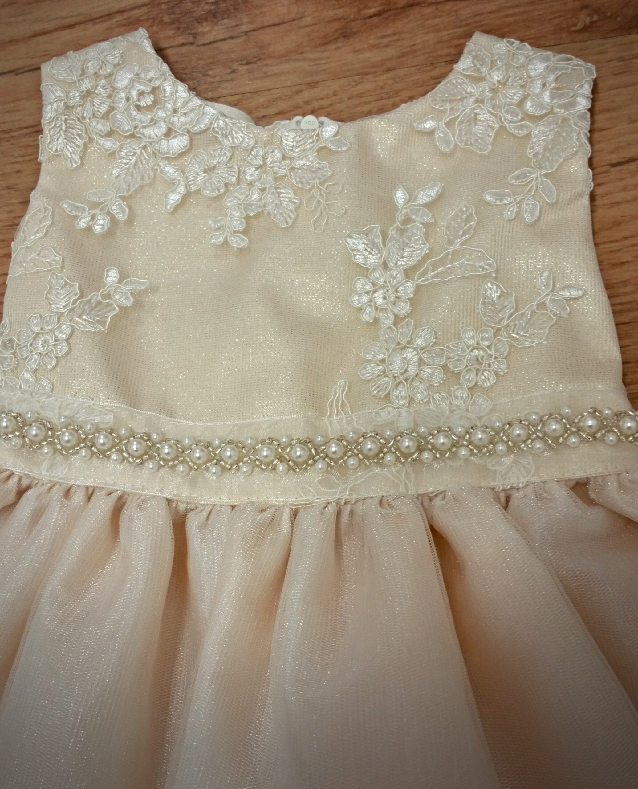 Ljuvlig finklänning i champagne (light gold). Ärmlös överdel i vacker spets, under det shimrande tyg i champagne ger fint lyster. Pärlband dekorerar midjan, breda knytband i tyll i ryggen. Stilren tyllkjol med två lager shimrande tyll, under tunnt satin samt underkjol med tyllkant. Blixtlås. Passar mycket fint till kommande högtider och bröllop.