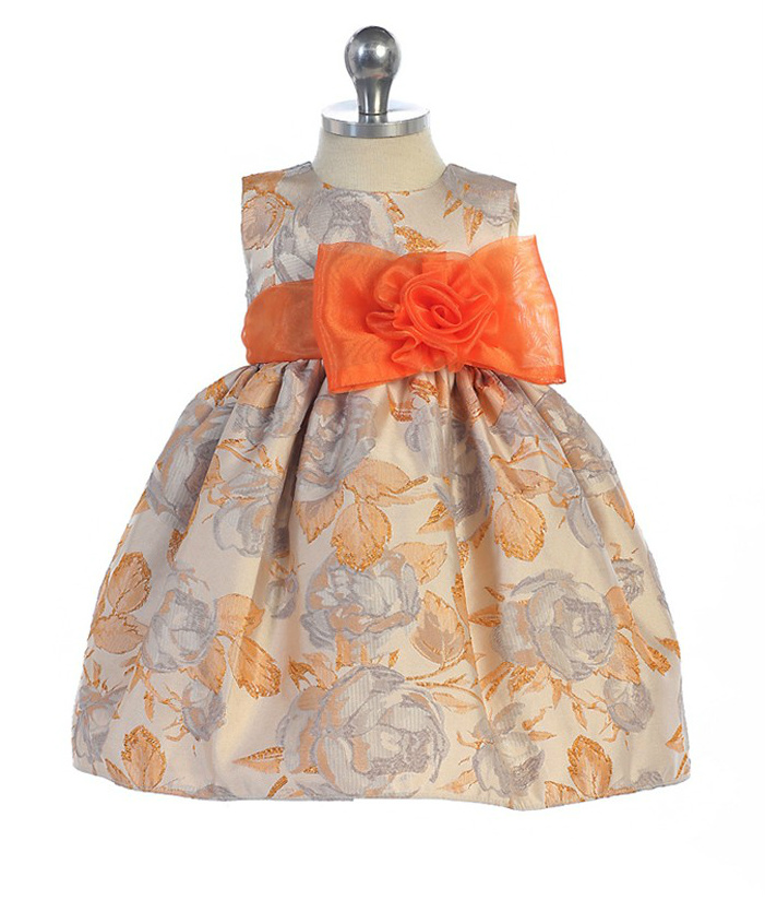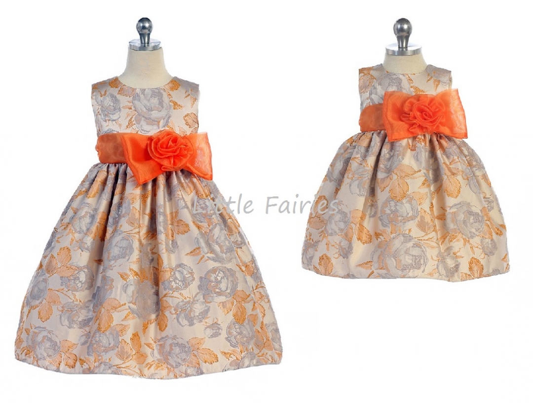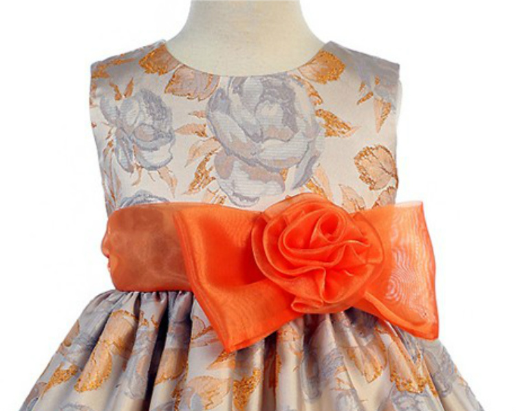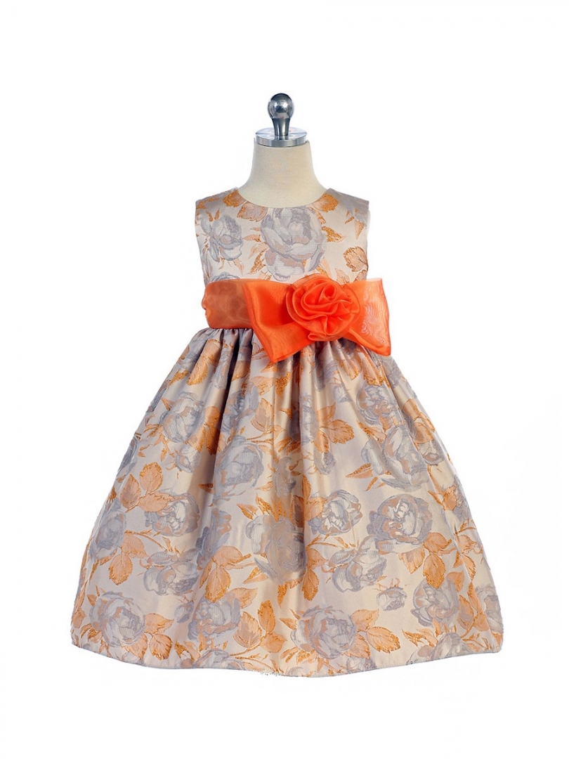 Vacker ärmlös klänning med ett brett orange midjeband och avtagbar rosett och blomma. Mönstrad storblommig tyg i champagne, silver och varmt orange. Stilren och moderiktig klänning till bröllops och fest.