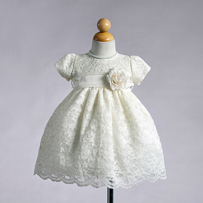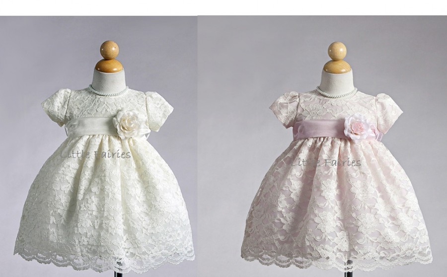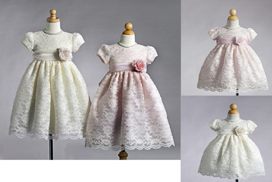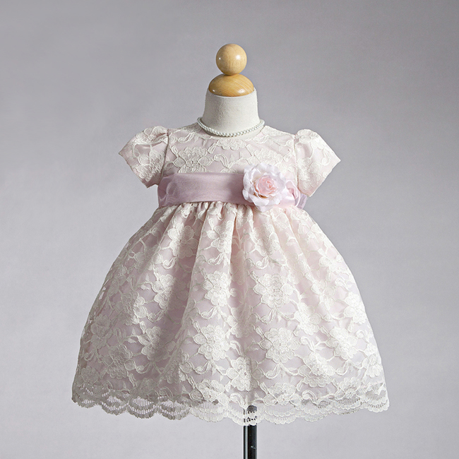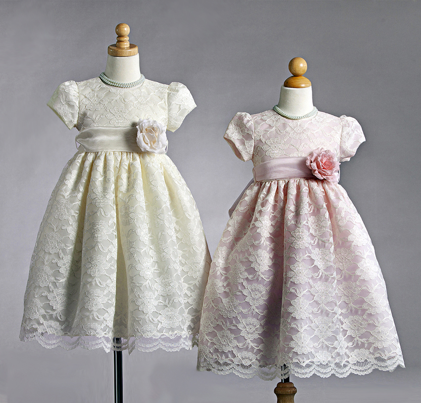 Ljuvlig spetsklänning med korta puffärmar. Passar utmärkt till brudnäbbar, till dop, fest och kalas. Blommig gräddvit spetstyg över antigen gräddvit eller rosa satin. Brett organza band på midjan som kan knytas till en rosett baktill. Underkjol med tyllkant. Avtagbar sidenblomma på midjan. Blixtlås baktill. Klänningens längd är ”ballerinalängd” – räcker till mitten av vaden.