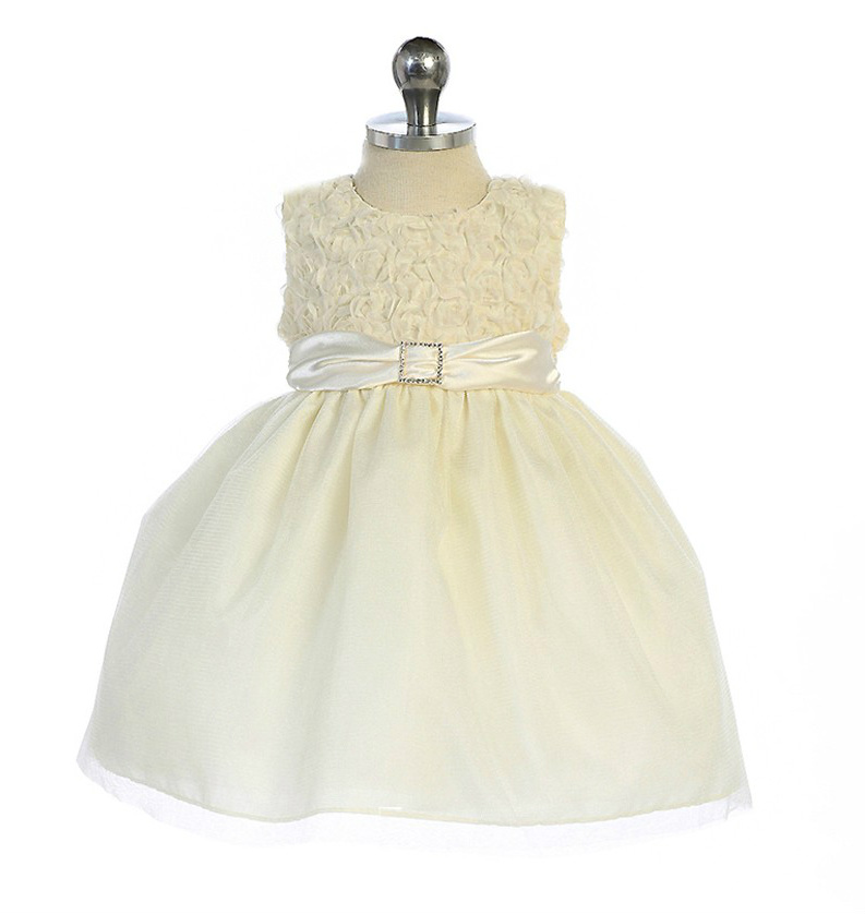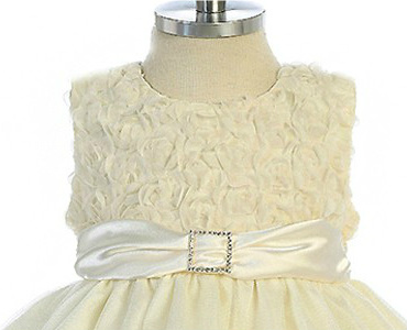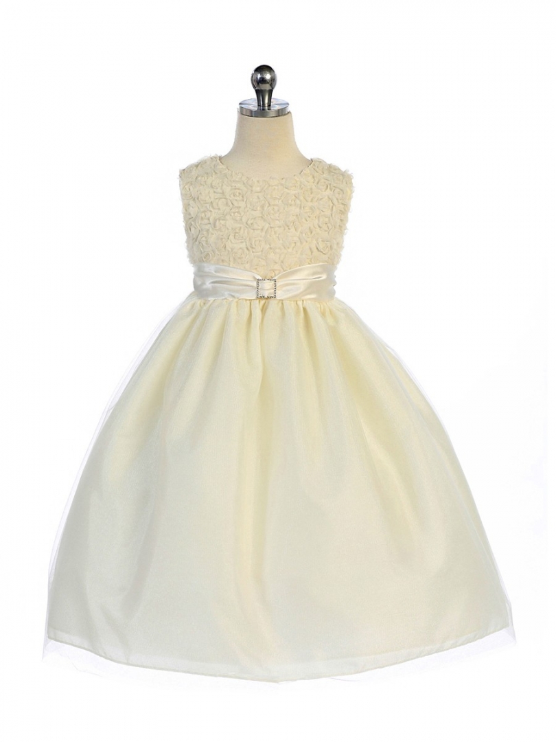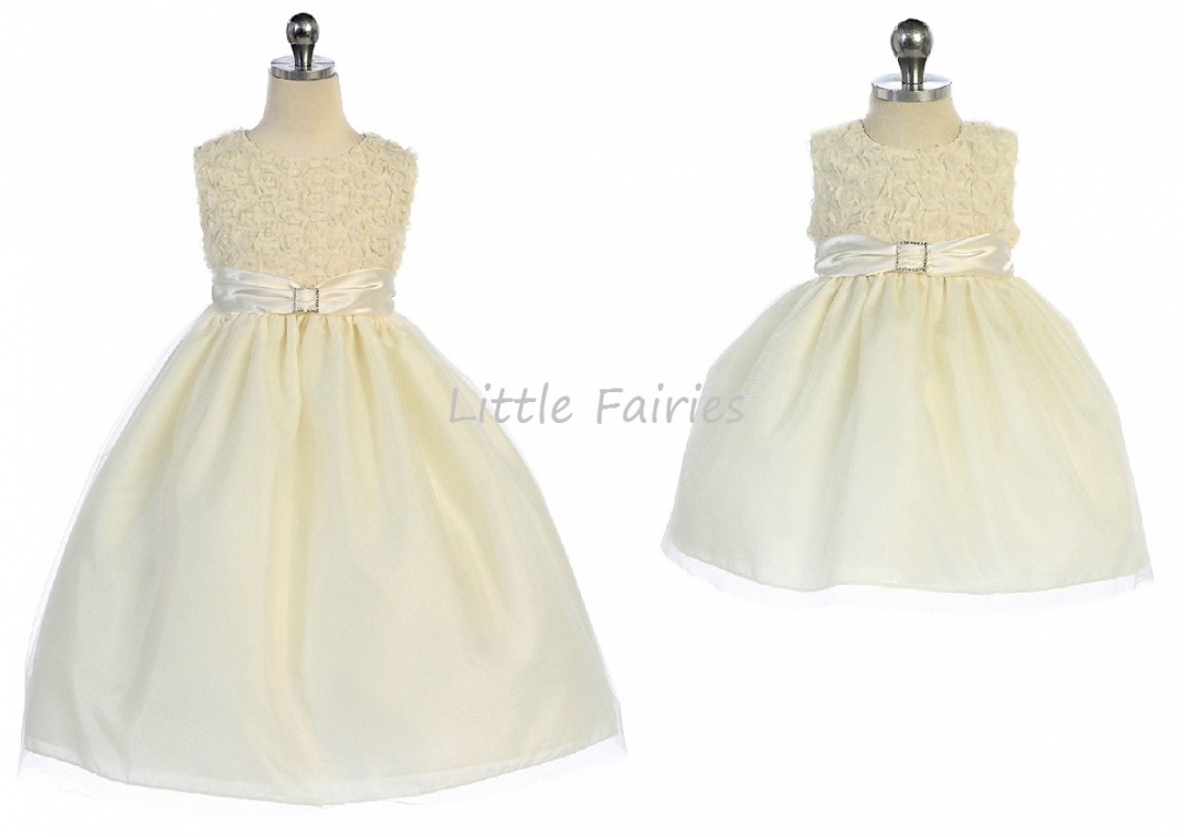 Vacker enfärgad ärmlös gräddvit festklänng. Livet är dekorerad med så morderna små ”3-dimentionella” snirklare blommor i mjukt organza tyg. Smalt band med brosch dekorerar midjan. Bandet fortsätter i ryggen och kan knytas till en rosett.  I kjolen två stycken skimrande tyllager över det tunna satin. Underkjol med tyllkant. Mycket vacker näbbklänning med modern tappning! Blixtlås i ryggen.