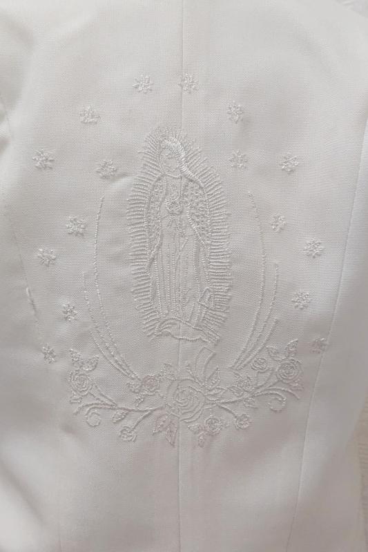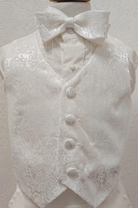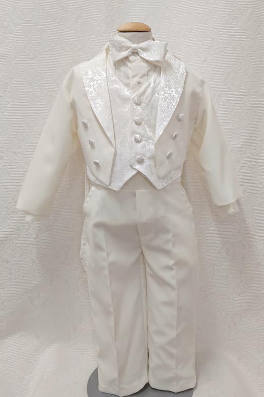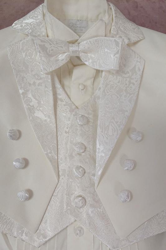 Gräddvit frack till små pojkar. Settet består av frackrock, väst, fluga, byxor och skjorta. Frackrock har jacquardmönstrad tyg på krage och knappar samt broderad Madonna i ryggen. Väst och fluga har jacquardmönstrad tyg. Raka långbyxor med fickor och resår på midjan på ryggsidan. Långärmad gräddvit smoking skjorta med vingkrage och stråveck. Mycket stilig kostym som passar perfekt till dop eller andra festligheter.