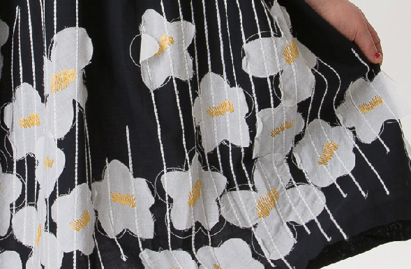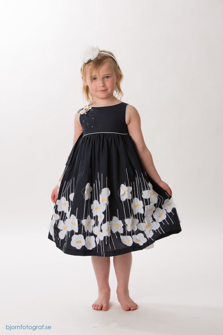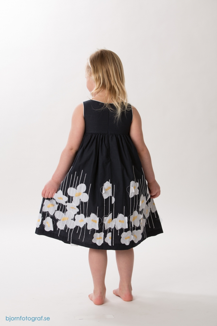 Söt ärmlös mörkblå festklänning med påsydda vita tygblommor på. Ärmöppningen, halsöppningen och höga midjan är markerade med vitt smalt band. Rynkad kjol med extra vidd. Vit underkjol. Blixtlås i ryggen. Mycket fin klänning till kalas, fest och bröllop.