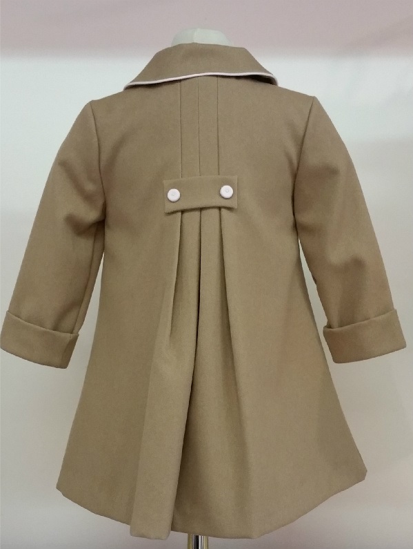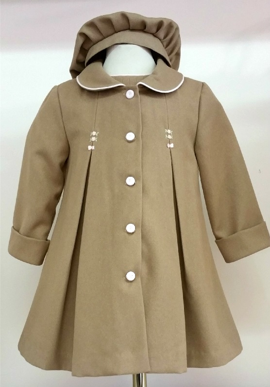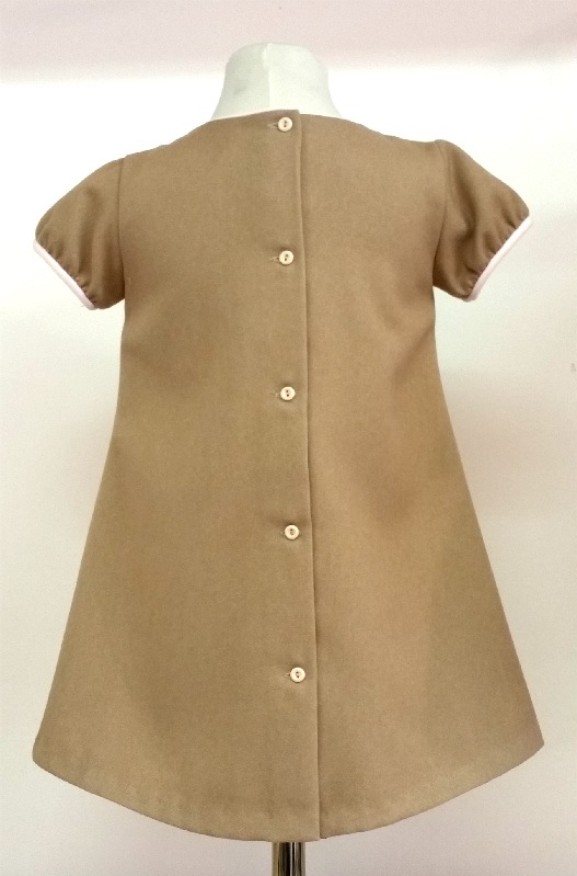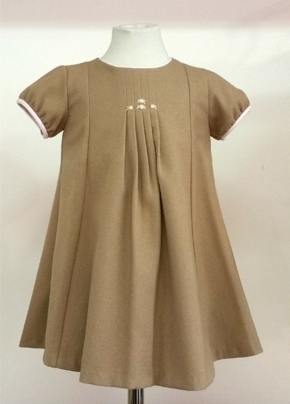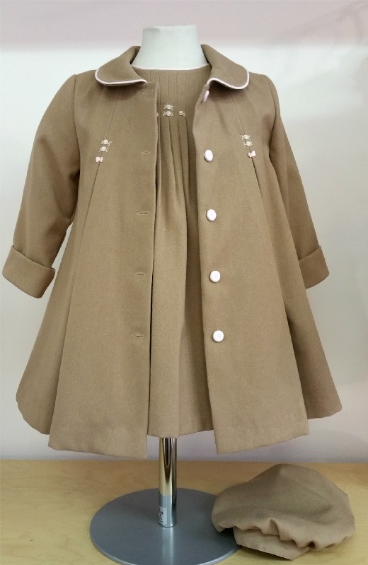 Ljuvlig khakifärgad 3-delad klänningsset. Kortärmad A-lindjeformad klänning med veck på framsidan. Söta blommor som dekoration på framsidan. Rosa kanband runt halsringningen och ärmar samt på knappar baktill. Stilig kappa och mössa. Mycket fin outfit för kalas och fest.