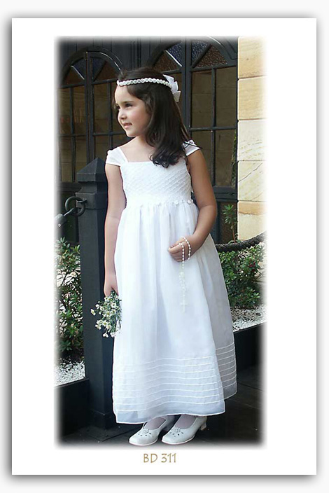 Fantastiskt söt vit näbbklänning i voile. Vilka detaljer! Breda axelband i organza med hansydda blommor på. Handsmockad med små vita pärlemor på. Midjan är dekorerat med handsydda sidenblommor på. Bred band på ryggen som kan knytas till en rosett. Underkjol i mjuk bomull med tyll i kjoldel mellan de två lager tyg. Handväska i tyg medföljer. Denna klänning passar utmärkt för bröllop eller första kommunion.