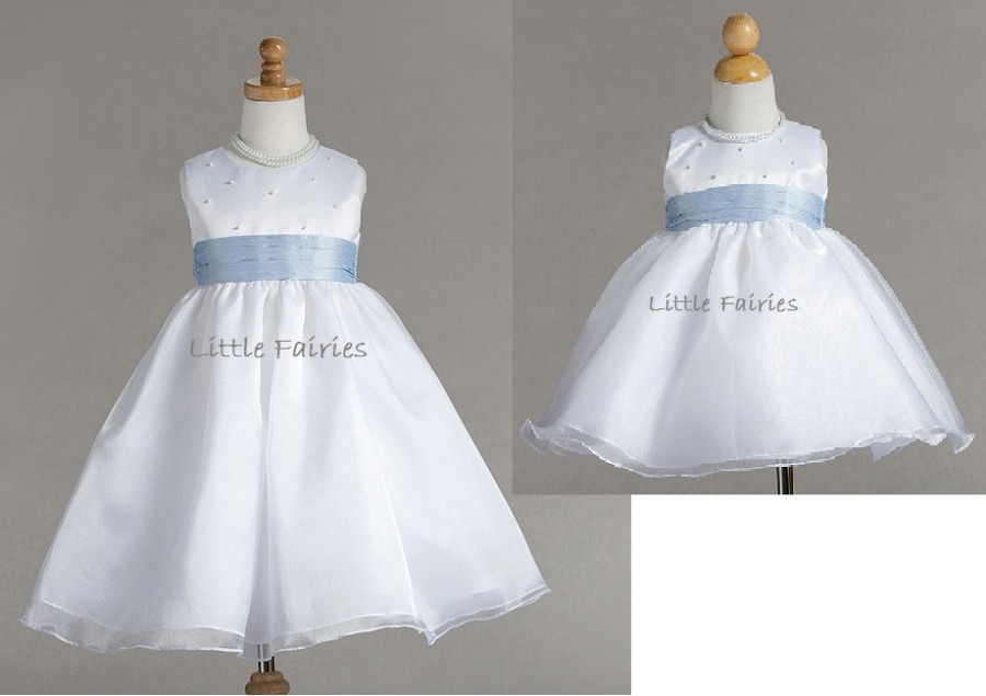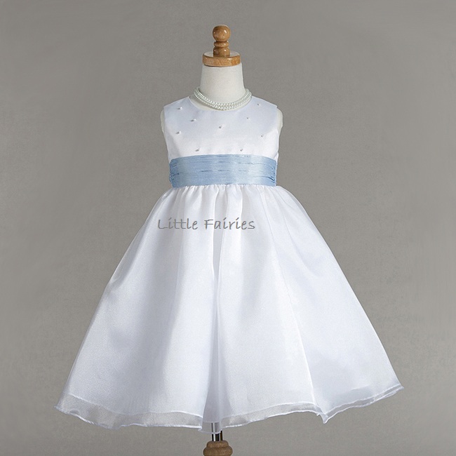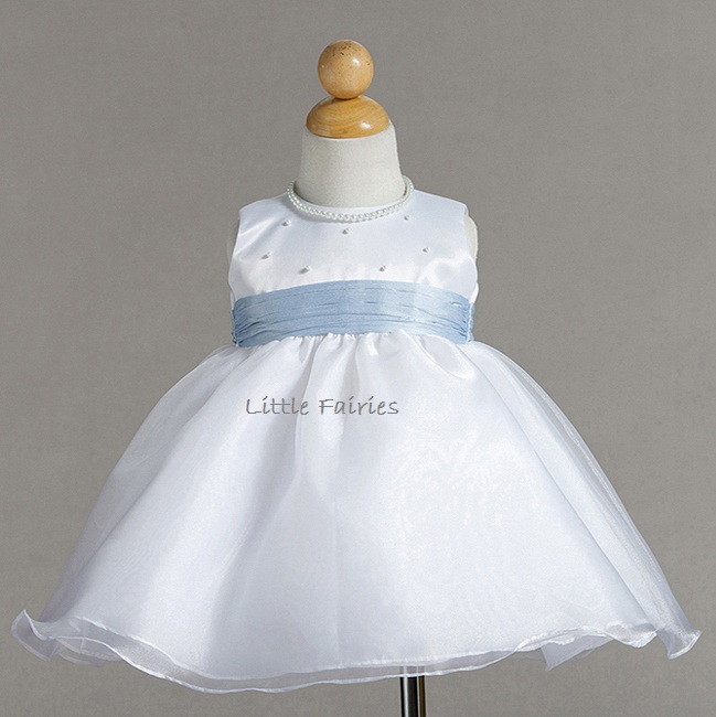 Underbart stilig ärmlös näbbklänning i vitt och ljusblått sidenband på midjan som kan knytas till en rosett baktill. Livet är dekorerad med små vita pärlor. Kjoldelen består av 2 lager; överst organza, under det tunnt satin och sedan underkjol med tyllkant. Blixtlås baktill. Denna vackra finklänning passar även som dopklänning.