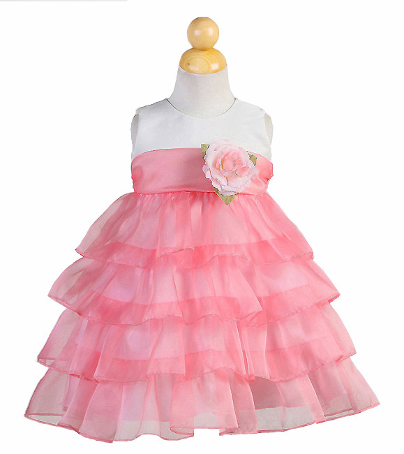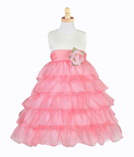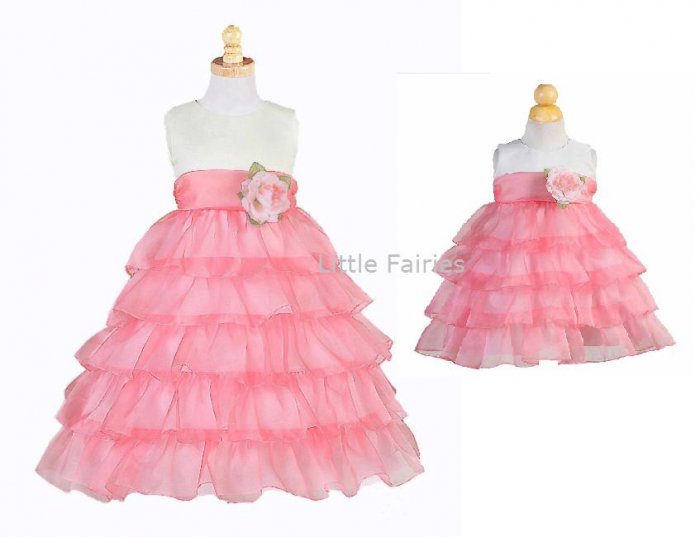 Otrolig fin näbbklänning med rikliga volanger. Stilren ärmlös ivory överdel. Kjoldel består av korallrosa organza volanger i flera lager. Korallrosa organza band på midjan som fortsätter baktill och kan knytas till en rosett. Avtagbar sidenblomma på midjan. Blixtlås baktill. Denna klänning är en riktig prinsessklänning!