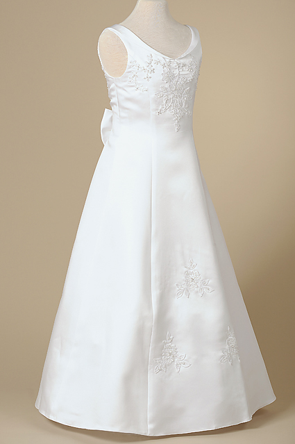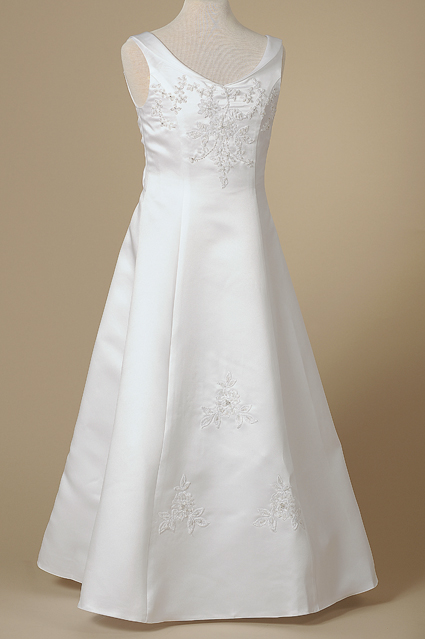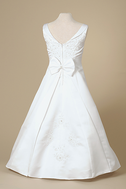 Förtjusande vacker och stilig ärmlös näbbklänning med smikrande A-linje kjol. Smal krage runt V-halsöppningen, samma detalj förekommer på baksidan. Klänningen är dekorerad med grupper av pärlor på livet, längst ner i mitten på framsidan samt på baksidan. Baksidan är otrolig vacker, kjoldelen har två veck och dekorationen i mitten. Låg skärning på ryggen samt rosett i mitten. Denna klänning är lika fin baktill som framtill. Underkjol med rejäl tyllkant. Denna stil passar till lite större flickor som vill ha lite mera vuxenkänsla på klänningen. Den är mycket smikrande på lite mulliga flickor. Denna näbbklänning är utöver det vanliga!
