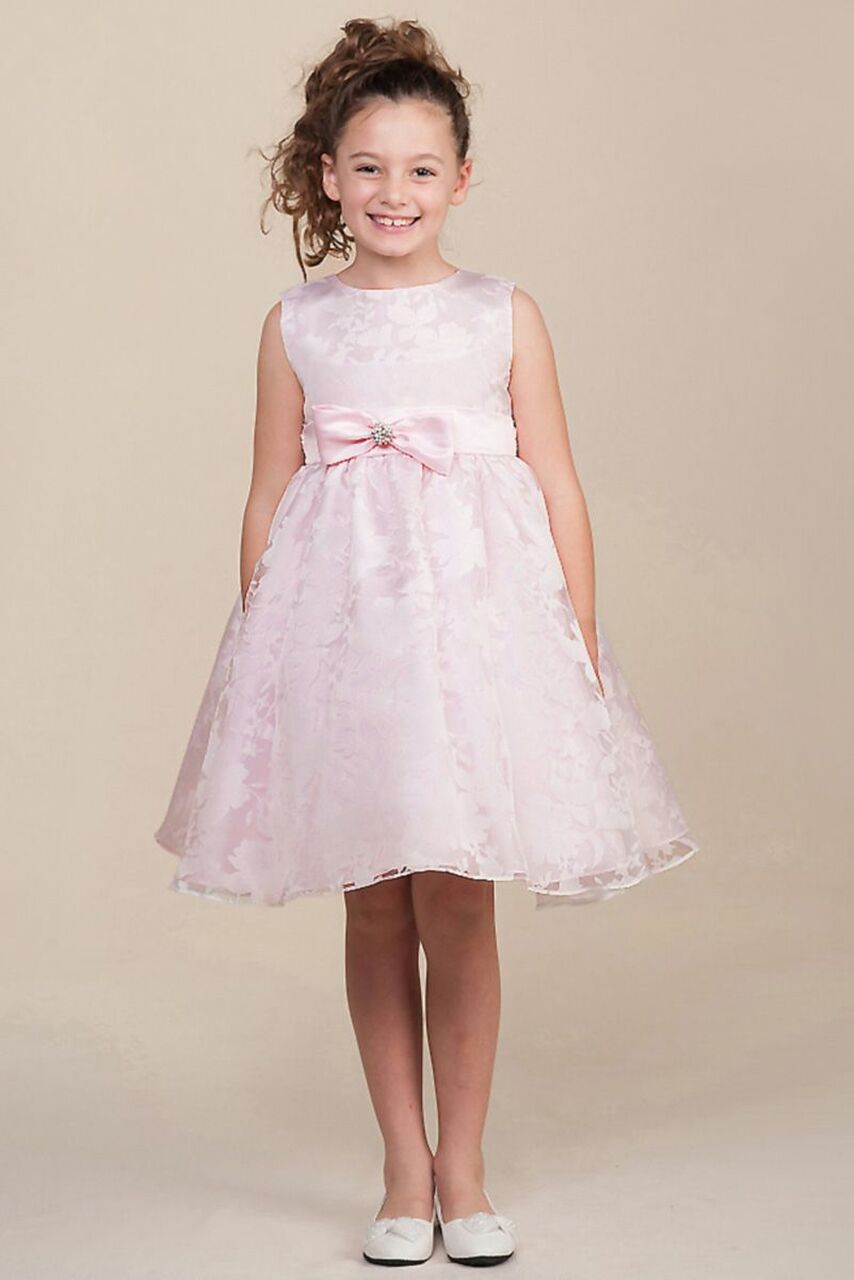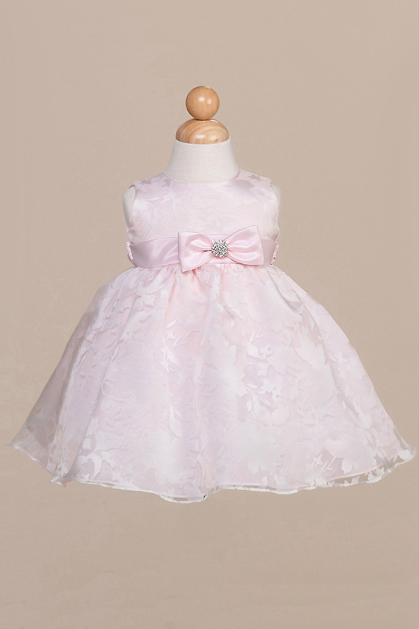 Vacker ärmlös festklänning för dop, kalas, fest och bröllop. Övresta organza lagret är mönstrad med stora blommor. Under det tunnt satin och underst underkjol med tyllkant. Bandd på midjan som kan knytas till en rosett baktill. Blixtlås baktill. Mycket romantisk finklänning som passar till alla högtider. OBS! rosett medföljer ej!