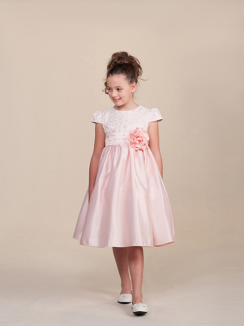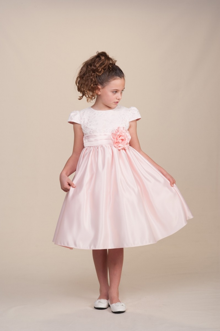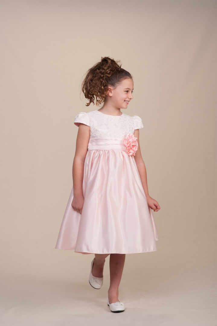 Vacker ljusrosa brudnäbbsklänning med korta puffärmar och med vacker spets på överdelen. Elegant vid kjol med brett band på midjan och breda band på ryggen so kan knytas till en rosett. Stor avtagbar tygblomma dekorerar midjan. Underkjol med tyllkant. Blixtlås på ryggen.