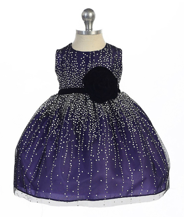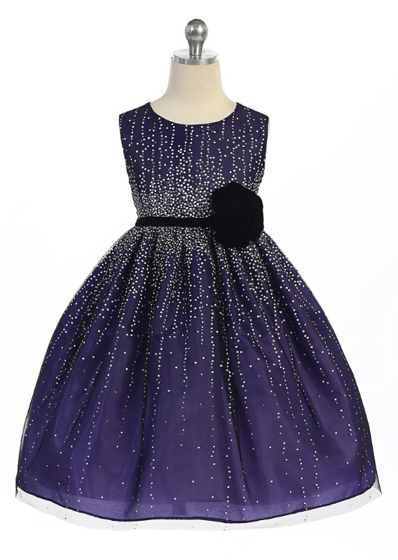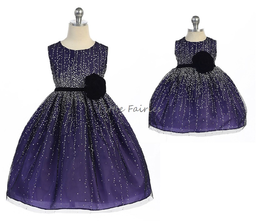 Vacker ärmlös mörklila / purpurfärgad brudnäbbsklänning med smalt sammetsband på midjans framsida. Tunnt svart tyll överst, under det lila satintyg. Breda svarta organzaband i ryggen som kan knytas till en stor vacker rosett. Hela klänningen är effektfullt dekorerat med silverglitter och små vita prickor både på livet och kjoldelen både fram och bak. Underst underkjol med tyllkant som ger vidd till klänningen. Blixtlås baktill. Mycket passande finklänning till bröllop eller fest.