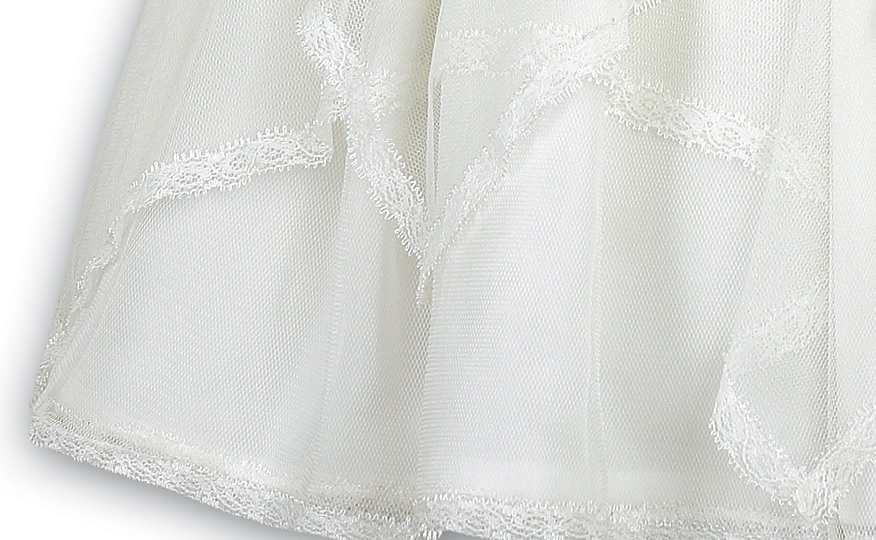 Spets applikationer och ofärgade paljetter på livet och på ryggen. Smalt blomsterband dekorerar midjan. Kjolen består av flera asymmetrsika lager av mjukt tyll som är dekorerad med kantband i spets. Rejäl underkjol ger kjolen extra vidd. Klänningen är helfodrad.