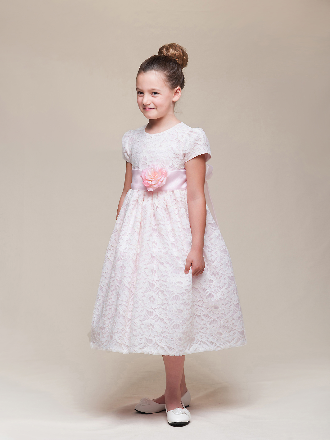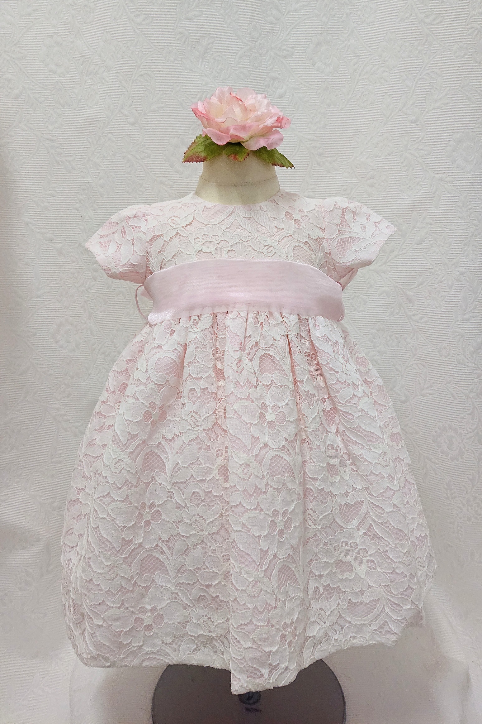 Ljuvlig spetsklänning med söta puffärmar. Vit spets över rosa tyg. Brett rosa organzaband och avtagbar sidenblomma på midjan, bandet kan knytas till en stor rosett baktill. Underkjol med tyllkant, blixtlås i ryggen. Längd ballerinalängd, dvs mitten av vaden. Utmärkt val för brudnäbbar, födelsedagsbarnet eller någon annan apeciell högtid!