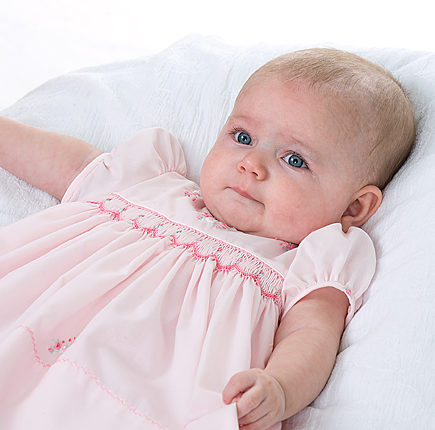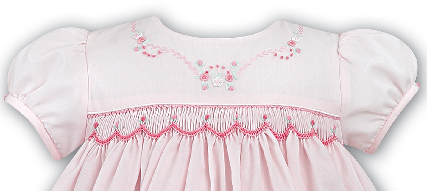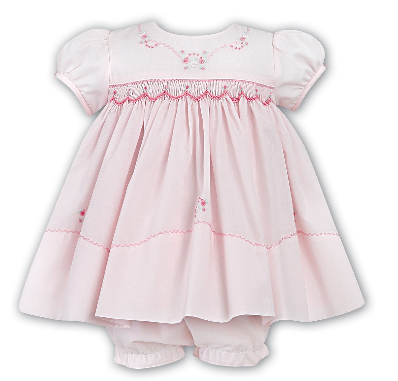 Ljuvlig kortärmad finklänning med smockad front. Vackra broderier dekorerar klänningen, vilka fina detaljer! Gillar du klassisk stil till barn så är denna klänning ett måste! Matchande trosor med volanger medföljer. Klänningen är fodrad med bomullstyg.