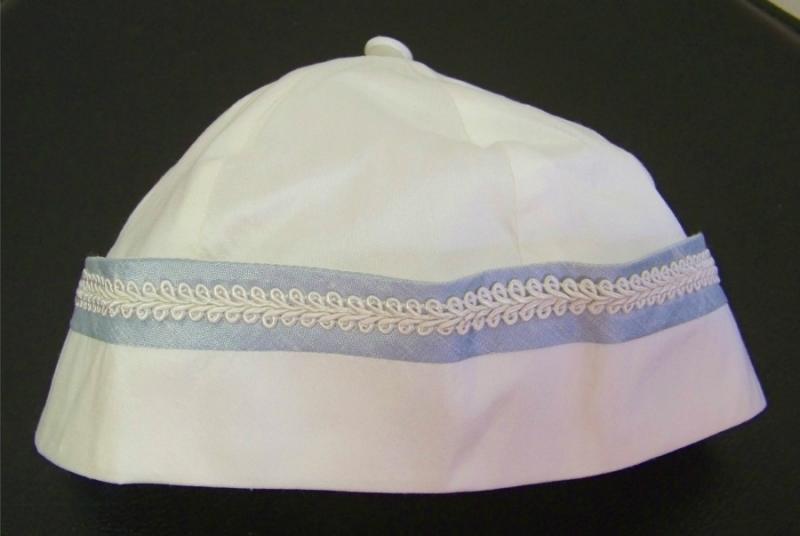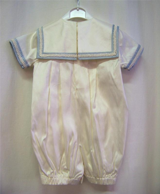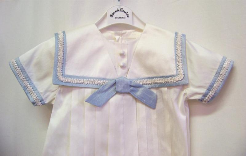 Exklusiv och festlig sidendress med tillhörande matroshatt i sjömansstil i finaste siden. Gräddvit dress med stor sjömanskrage kantad med ljusblått band. Framsida är dekorerat med 2 st knappar och en stor ljusblå sidenrosett. Flera veck på framsidan ger vid till dressen och bra utrymme till barnet. Knäppning baktill och mellan ben. Korta ben – ”shorts” modell.