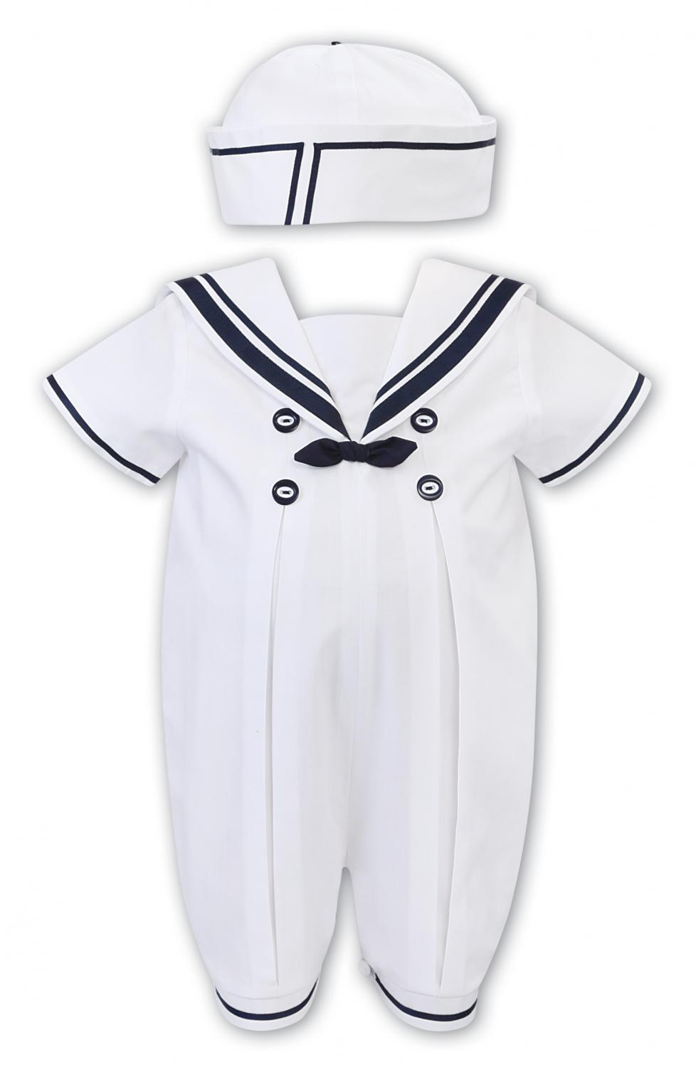 Klassisk vit sjömansdress med matchande sjömanshatt och marinblåa detaljer. Sjömanskrage och vackra knappar framtill. Knäppning i ryggen och mellan ben underlättar blöjbyte. Detta är en shortsmodell med kortare ben. Helfodrad. Så fint till dop, fest och bröllop. Spara till barnet, klassiska barnkläder håller flera generationer 🙂